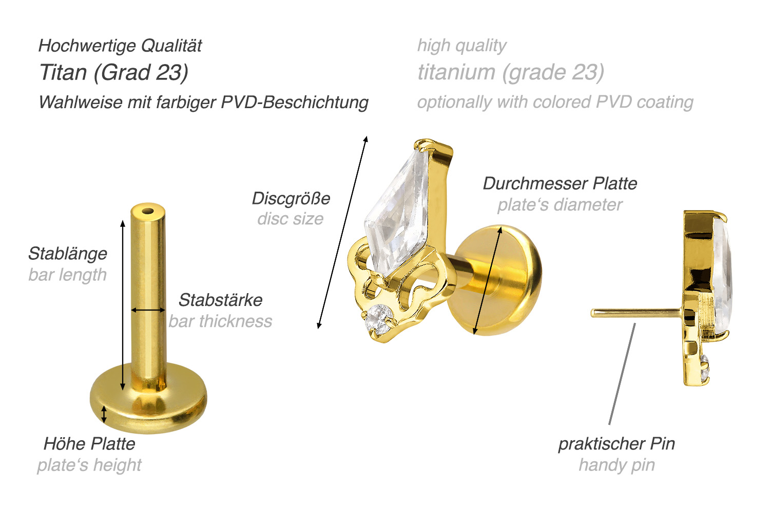 or 1.2 mm and is available with the bar lengths listed below. Due to the push fit technology used, the labret can be combined at will with all of our attachments with push pin.