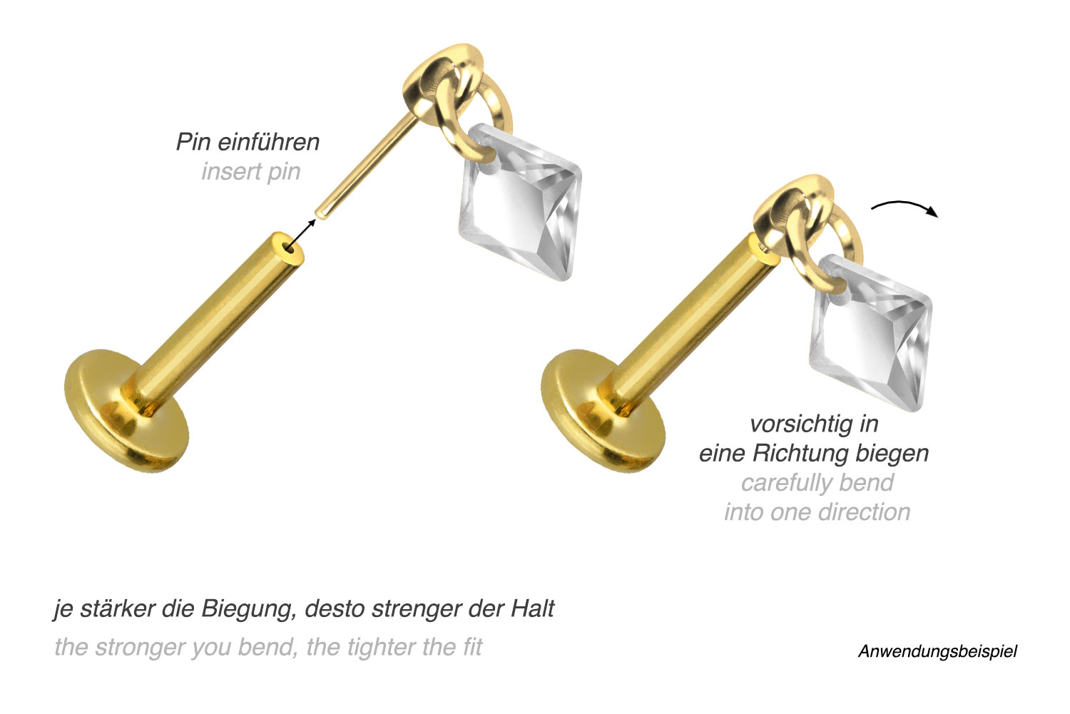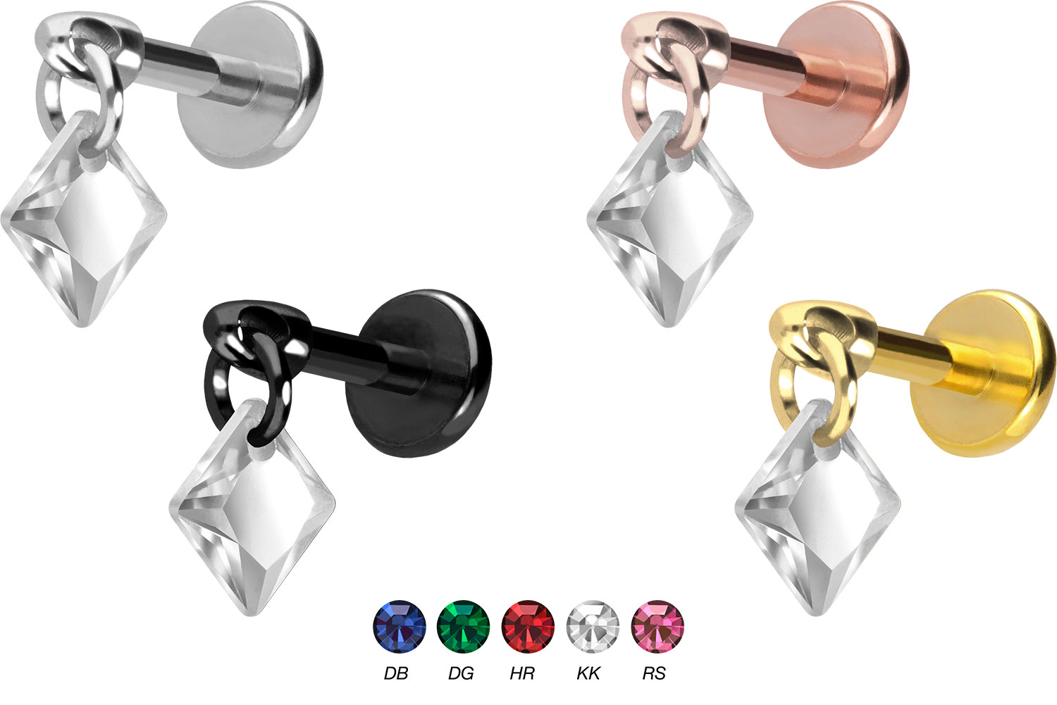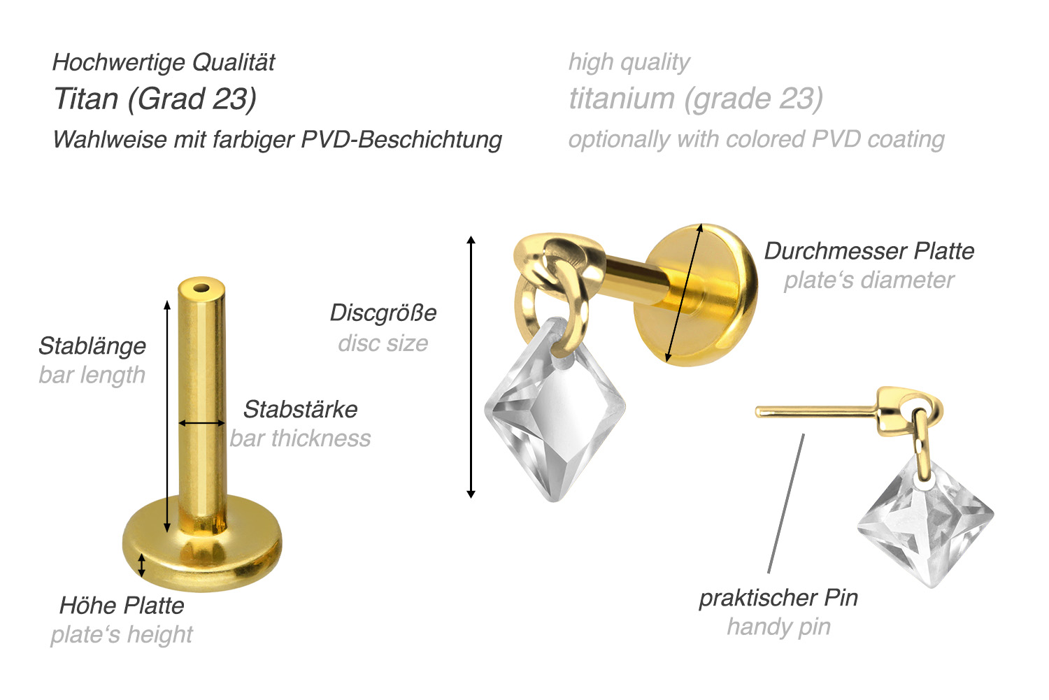 This unique labret is made of high quality titanium, which is also known for material properties such as particularly good skin compatibility and high durability. Another of its advantages is color fastness, also guaranteed in the colored versions with PVD coating. The labret is supplied with a timelessly beautiful attachment with push pin in form of a sparkling square, has a bar thickness of either 1 or 1.2 mm and is available with the bar lengths listed below. Due to the push fit technology used, the labret can be combined at will with all of our attachments with push pin.