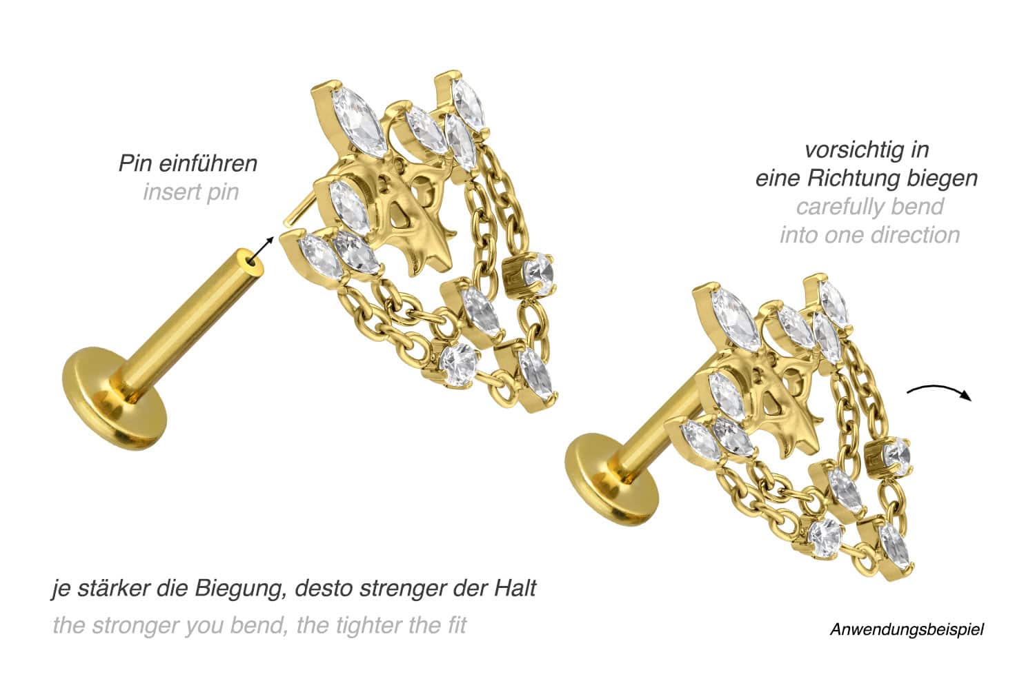 is supplied with a timelessly beautiful attachment with push pin in form of a gothic crown, combined with several chains, has a bar thickness of either 1