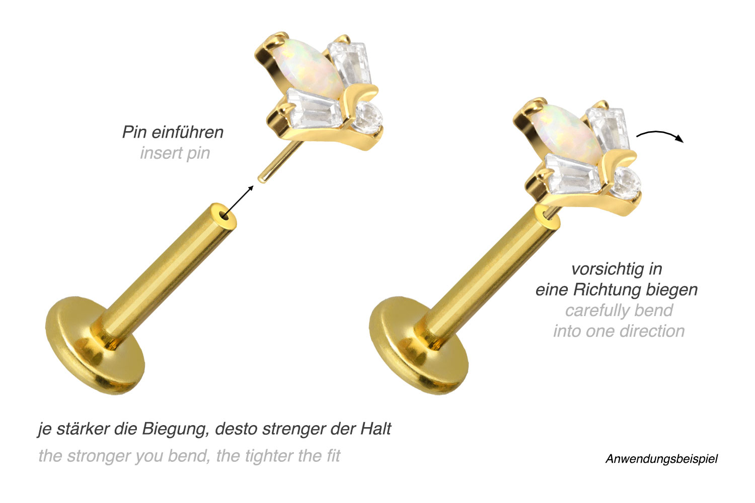 or 1.2 mm and is available with the bar lengths listed below. Due to the push fit technology used, the labret can be combined at will with all of our attachments with push pin.