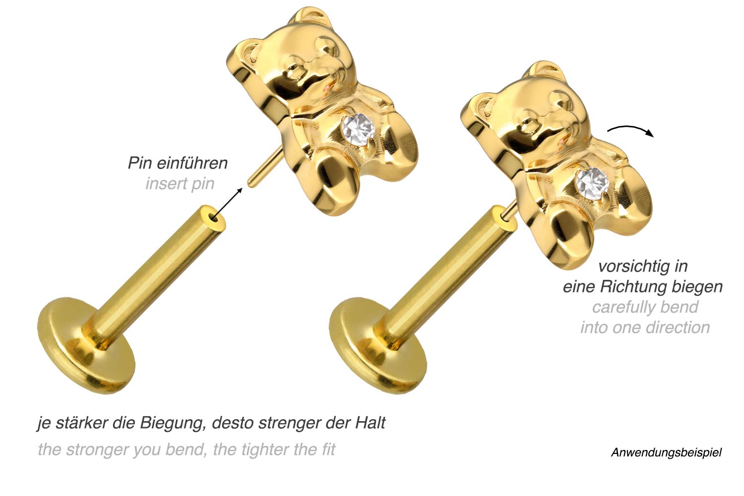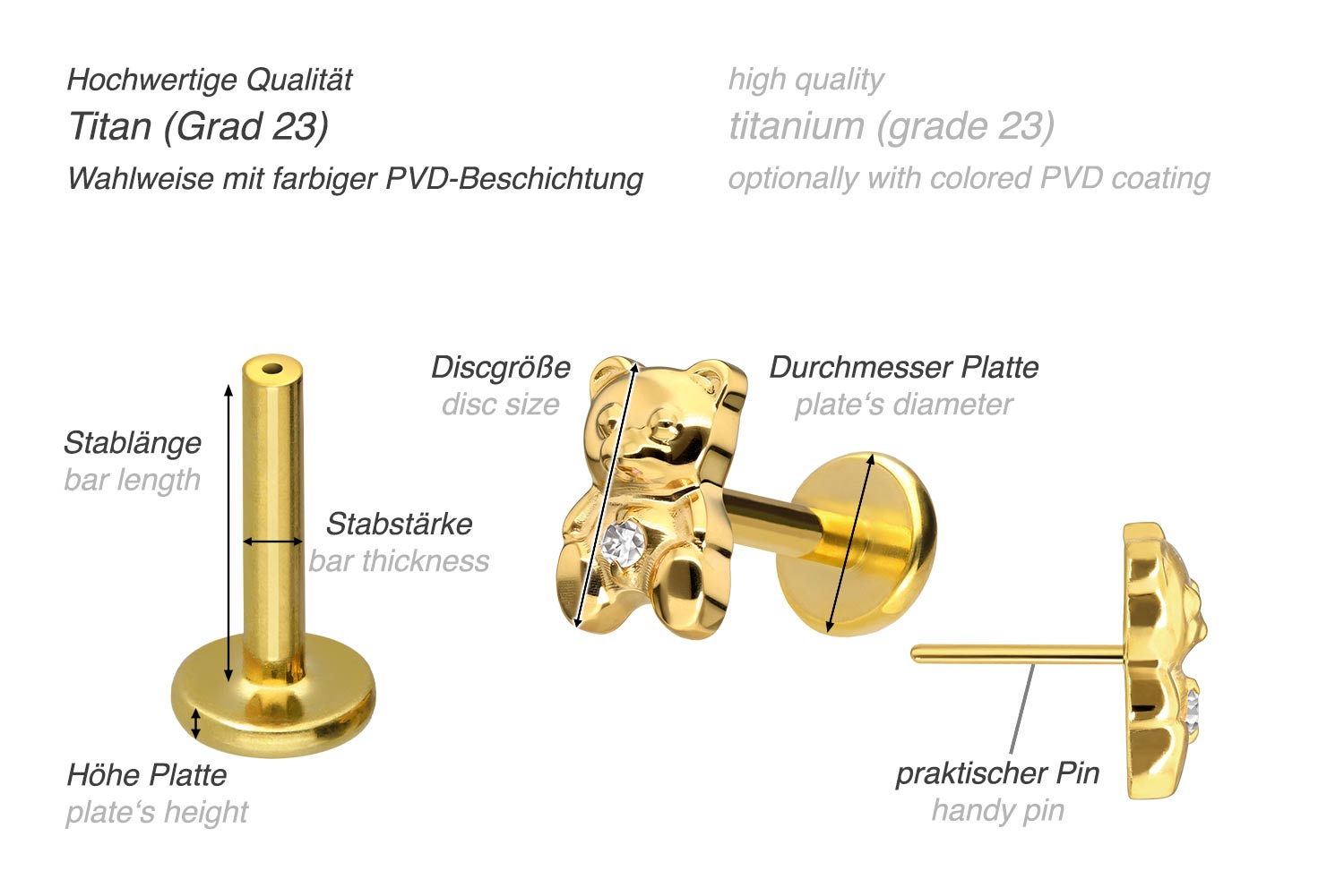 or 1.2 mm and is available with the bar lengths listed below. Due to the push fit technology used, the labret can be combined at will with all of our attachments with push pin.