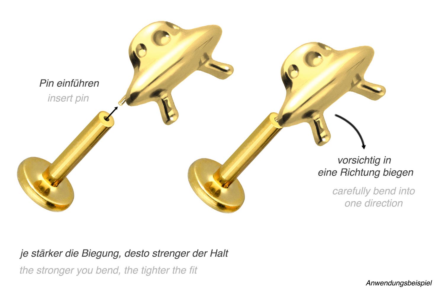 or 1.2 mm and is available with the bar lengths listed below. Due to the push fit technology used, the labret can be combined at will with all of our attachments with push pin.