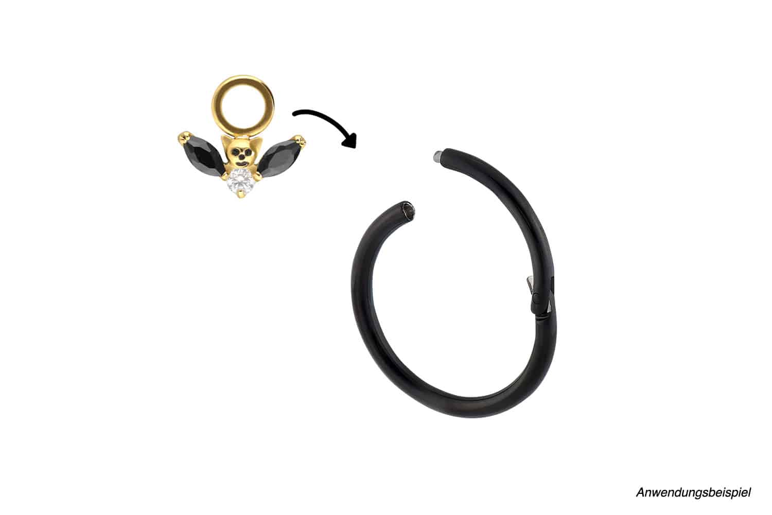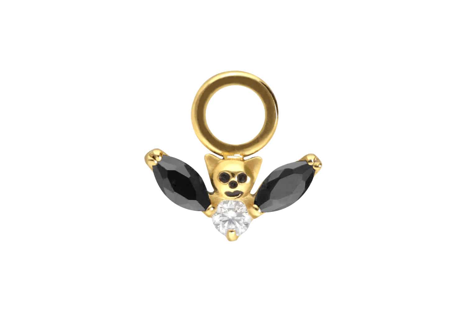 Clickers with a bar thickness from 0.8 mm to 2 mm are given an imaginative and thus also individual design thanks to our unique pendants! For this, the clicker must only be opened and the piece of jewelry attached. It is made of high quality titanium (grade 23), whose material properties include fgood skin compatibility and high durability. On top of that, there is color fastness, guaranteed in the silver-colored as well as in the variant with the gold-colored PVD coating. Thus, this delightful pendant in the shape of a crystal-studded bat becomes an excellent addition to any matching clicker!