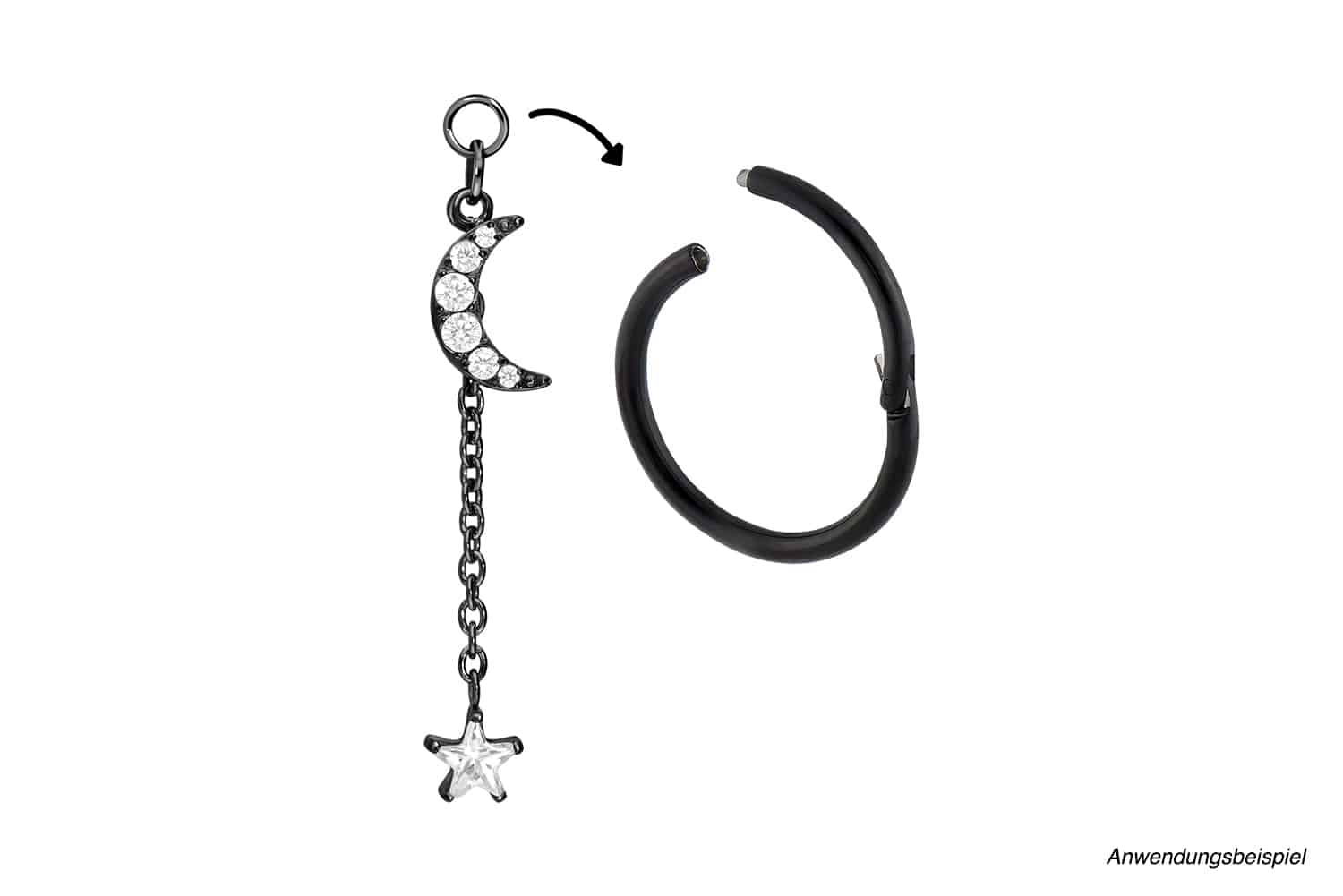 Clickers with a bar thickness from 0.8 mm to 2 mm are given an imaginative and thus also individual design thanks to our unique pendants! For this, the clicker must only be opened and the piece of jewelry attached. It is made of high quality titanium (grade 23), whose material properties include good skin compatibility and high durability. On top of that, there is color fastness, guaranteed in the silver-colored as well as in the other variants with colored PVD coating. Thus, this delightful pendant in the shape of a crystal studded moon and a crystal star, which are connected through a chain, becomes an excellent addition to any matching clicker!