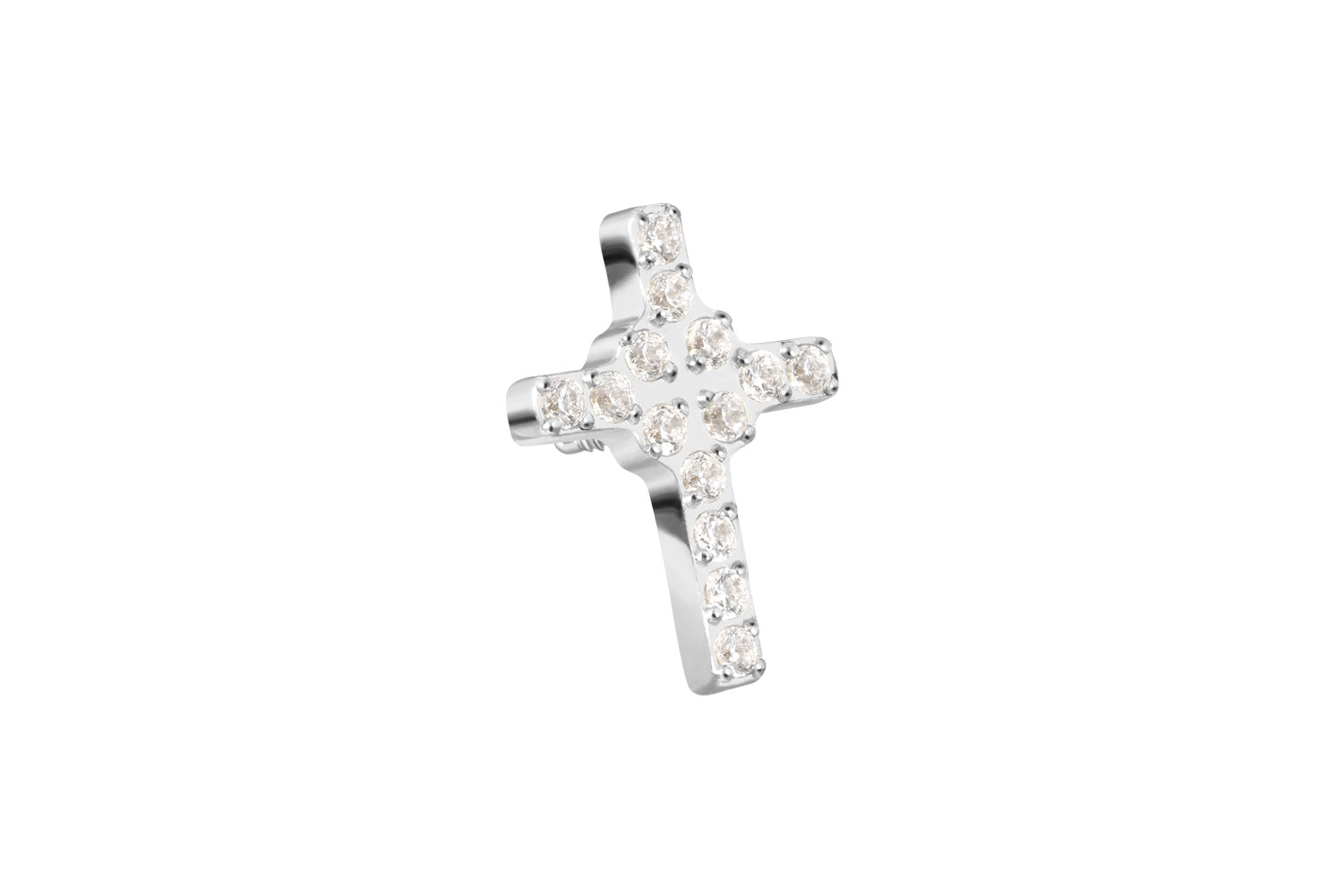 This timelessly beautiful screw-in attachment in the form of a crystal cross was specially developed for our internal thread piercings and is made of high quality titanium, which among other advantages is characterized by good skin compatibility and high durability. Also one of its specific material properties is color fastness, guaranteed in the silver-colored variant as well as in the black, gold and rosegold-colored variants with PVD coating. Since the 0.9 mm external thread of the attachment is compatible with all our products with this kind of internal thread, there are various combination possibilities.