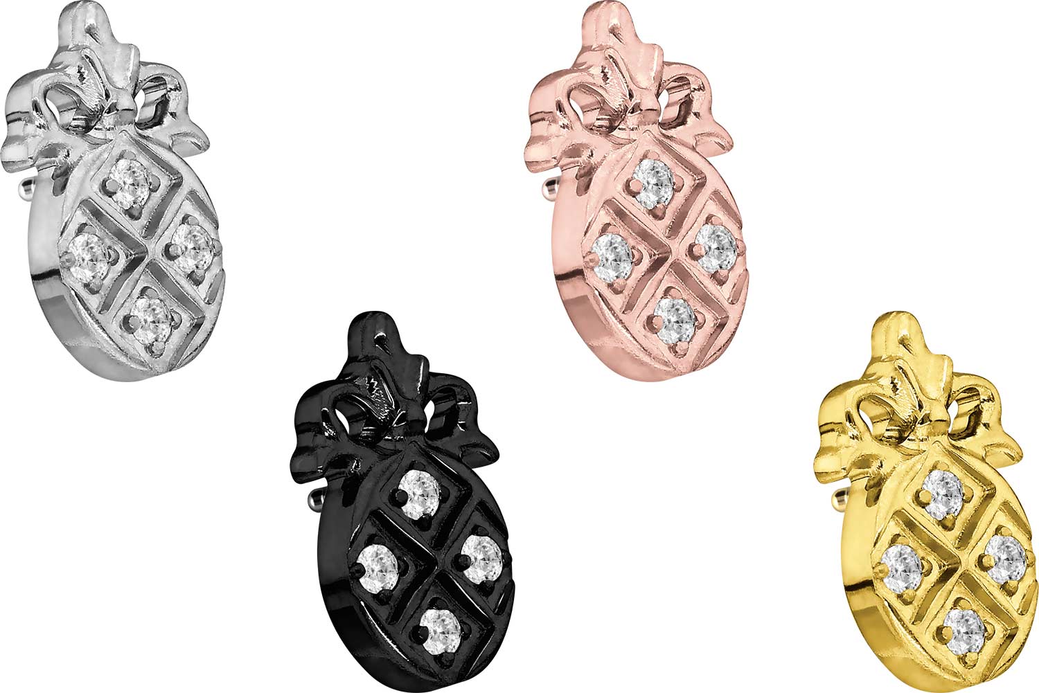 This timelessly beautiful screw-in attachment in the form of a sparkling pineapple was specially developed for our internal thread piercings and is made of high quality titanium, which among other advantages is characterized by good skin compatibility and high durability. Also one of its specific material properties is color fastness, guaranteed in the silver-colored variant as well as in the black, gold and rosegold-colored variants with PVD coating. Since the 0.9 mm external thread of the attachment is compatible with all our products with this kind of internal thread, there are various combination possibilities.
