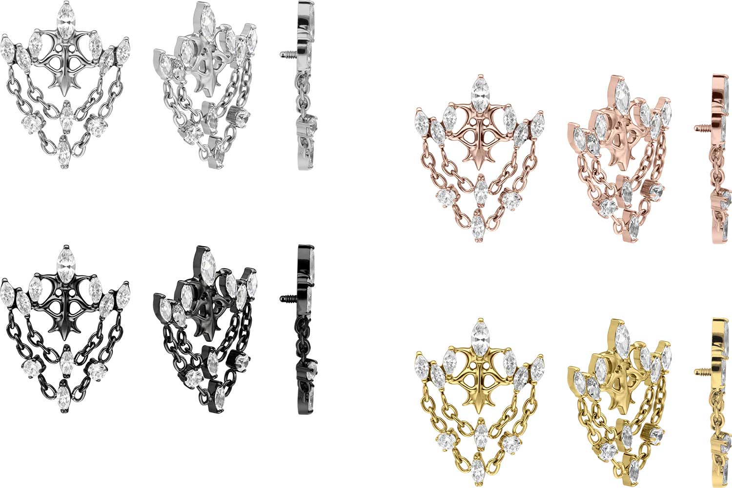 This timelessly beautiful screw-in attachment in the form of a gothic crown, combined with several chains, was specially developed for our internal thread piercings and is made of high quality titanium, which among other advantages is characterized by good skin compatibility and high durability. Also one of its specific material properties is color fastness, guaranteed in the silver-colored variant as well as in the black, gold and rosegold-colored variants with PVD coating. Since the 0.9 mm external thread of the attachment is compatible with all our products with this kind of internal thread, there are various combination possibilities.