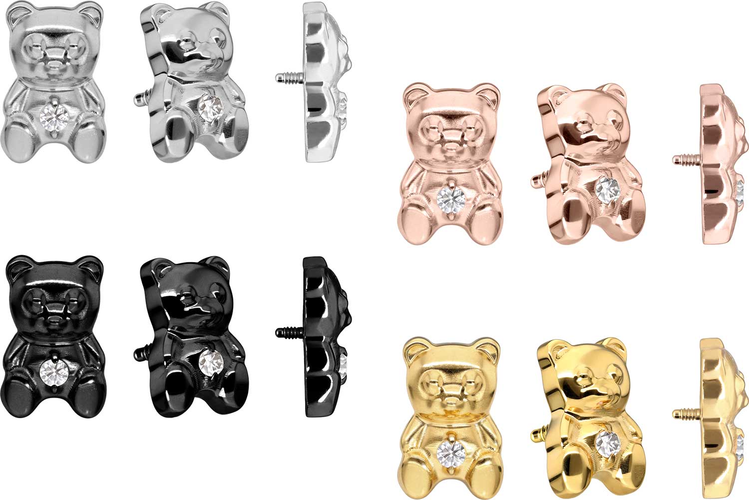 This timelessly beautiful screw-in attachment in the form of a teddy bear was specially developed for our internal thread piercings and is made of high quality titanium, which among other advantages is characterized by good skin compatibility and high durability. Also one of its specific material properties is color fastness, guaranteed in the silver-colored variant as well as in the black, gold and rosegold-colored variants with PVD coating. Since the 0.9 mm external thread of the attachment is compatible with all our products with this kind of internal thread, there are various combination possibilities.