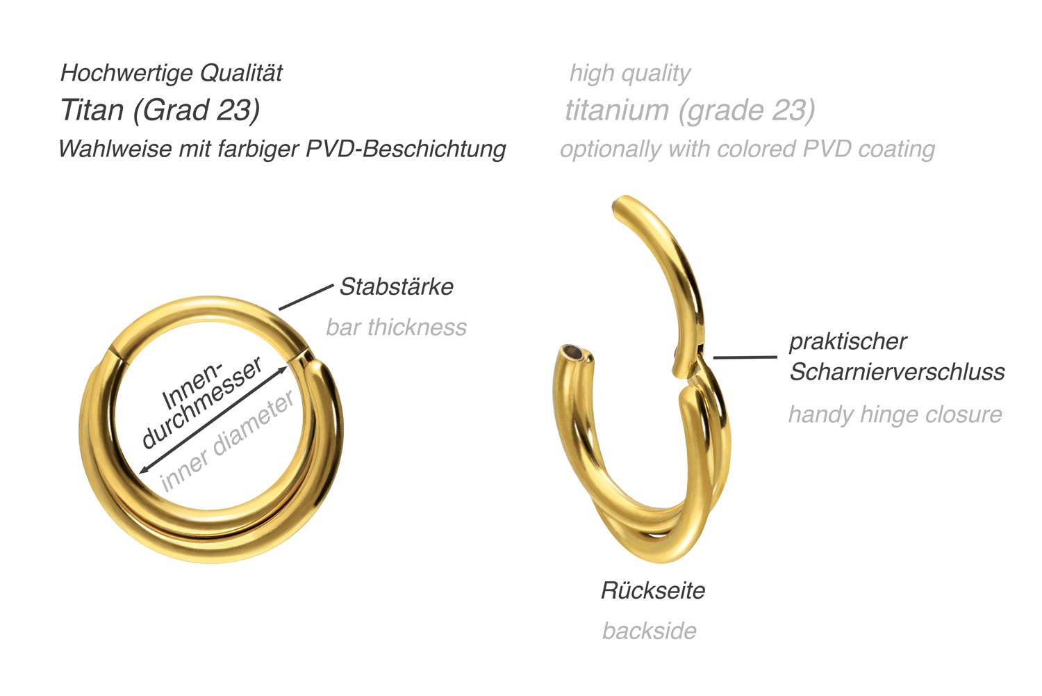 Easy handling and gorgeous design - that is what our clickers are all about! The main feature of the clickers is the practical hinge, which simplifies the insertion. The material used for manufacturing (titanium grade 23) is characterized by its good skin compatibility, high quality and durability. Depending on the desired color the piercing is covered with a scratch-resistant PVD coating. Particularly appealing is the stylish design, wich consists of two crossed rings. Whether at the ear, the nose or the lip - our clickers are suitable for a variety of different piercing locations. This clicker is available with the bar thicknesses and inner diameters listed below.