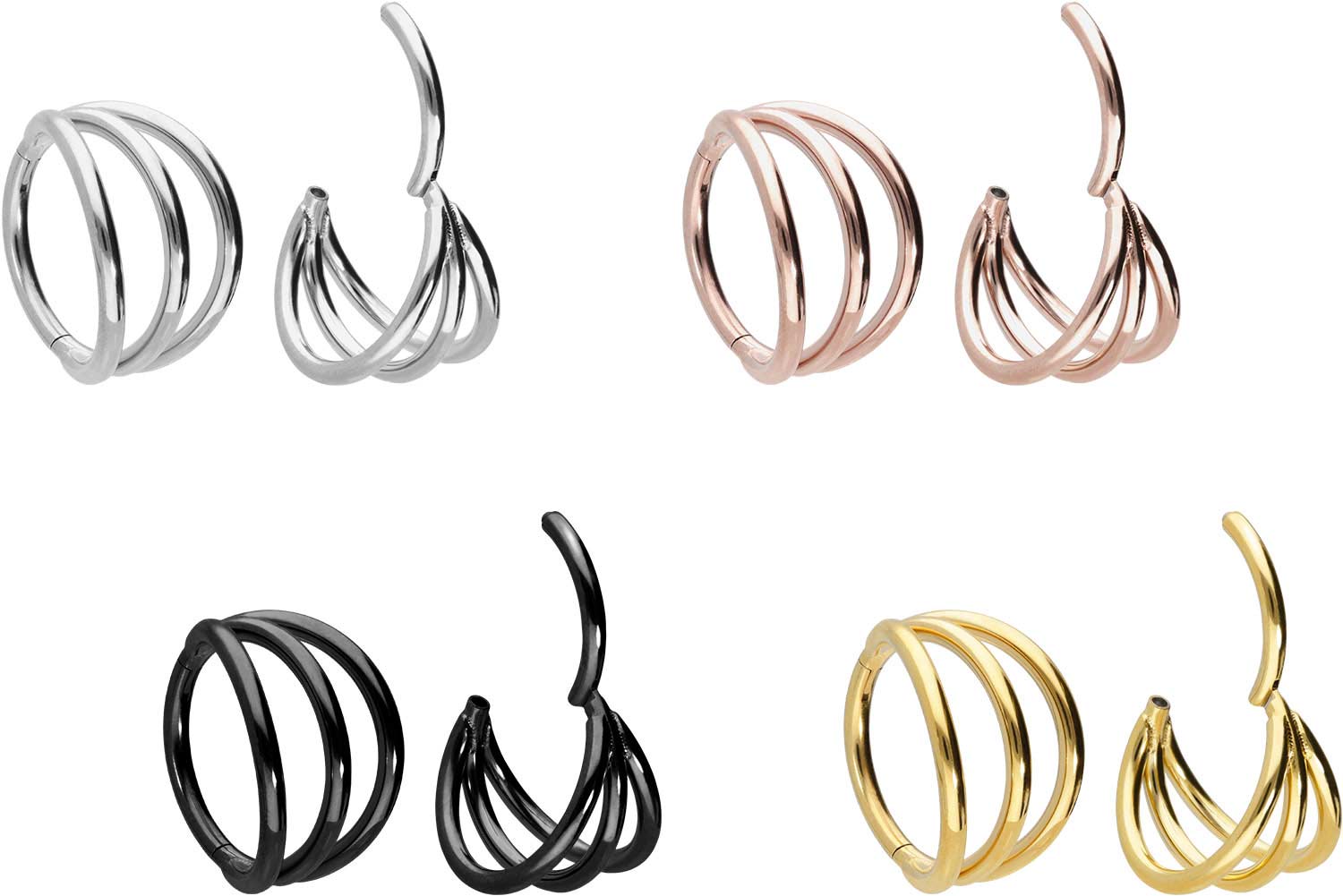 Easy handling and gorgeous design - that is what our clickers are all about! The main feature of the clickers is the practical hinge, which simplifies the insertion. The material used for manufacturing (titanium grade 23) is characterized by its good skin compatibility, high quality and durability. Depending on the desired color, the piercing is covered with a scratch-resistant PVD coating. Particularly elaborate and thus equally impressive are the three rings. Whether at the ear, the nose or the lip - our clickers are suitable for a variety of different piercing locations. This clicker has a bar thickness of 1.2 mm, while its available inner diameters are listed below.Material: titanium (grade 23)