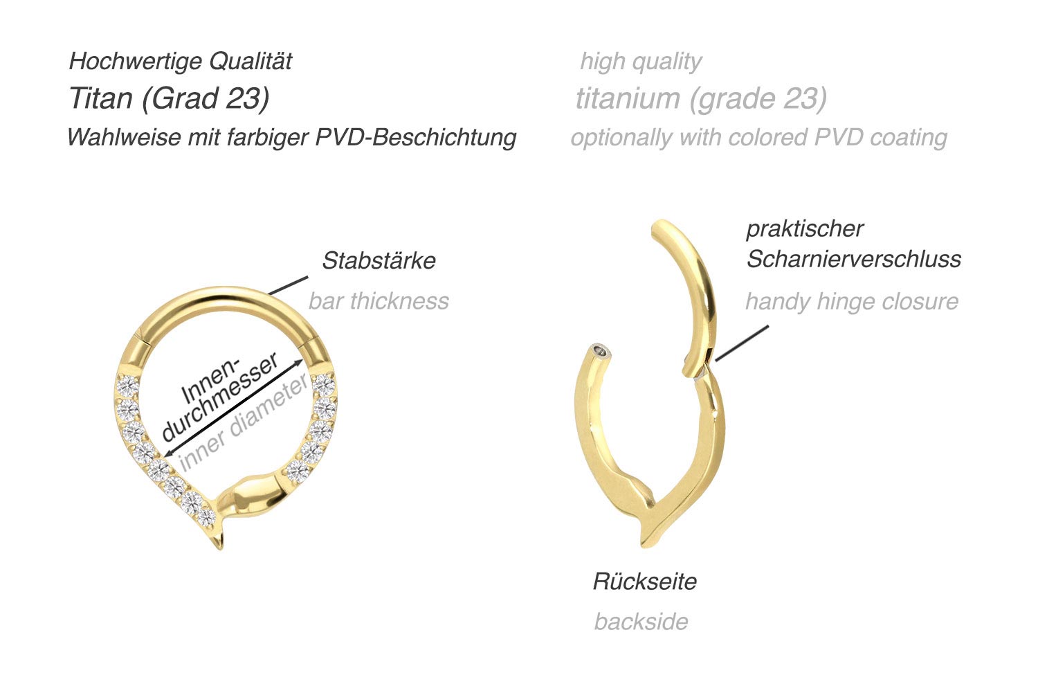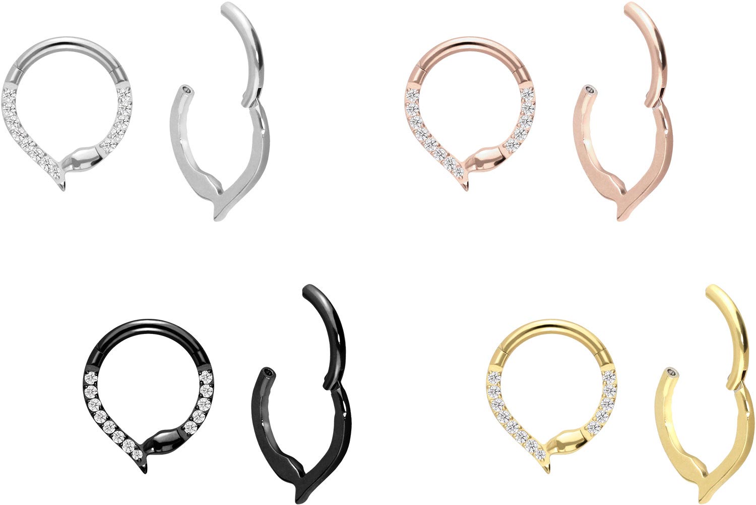 Easy handling and gorgeous design - that is what our clickers are all about! The main feature of the clickers is the practical hinge, which simplifies the insertion. The material used for manufacturing (titanium grade 23) is characterized by its good skin compatibility, high quality and durability. Depending on the desired color, the piercing is covered with a scratch-resistant PVD coating. As a special highlight the design reminding of a snake decorated with sparkling crystals adorns the piece of jewelry. Whether at the ear, the nose or the lip - our clickers are suitable for a variety of different piercing locations. This clicker has a bar thickness of 1.2 mm, while its available inner diameter is 8 mm.Material: titanium (grade 23)