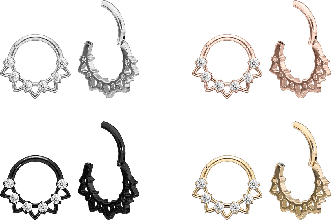 Easy handling and gorgeous design - that is what our clickers are all about! The main feature of the clickers is the practical hinge, which simplifies the insertion. The material used for manufacturing (titanium grade 23) is characterized by its good skin compatibility, high quality and durability. Depending on the desired color, the piercing is covered with a scratch-resistant PVD coating. As a special highlight the design with the sparkling crystals and cones adorns the piece of jewelry. Whether at the ear, the nose or the lip - our clickers are suitable for a variety of different piercing locations. This clicker has a bar thickness of 1.2 mm, while its available inner diameter is 8 mm.Material: titanium (grade 23)