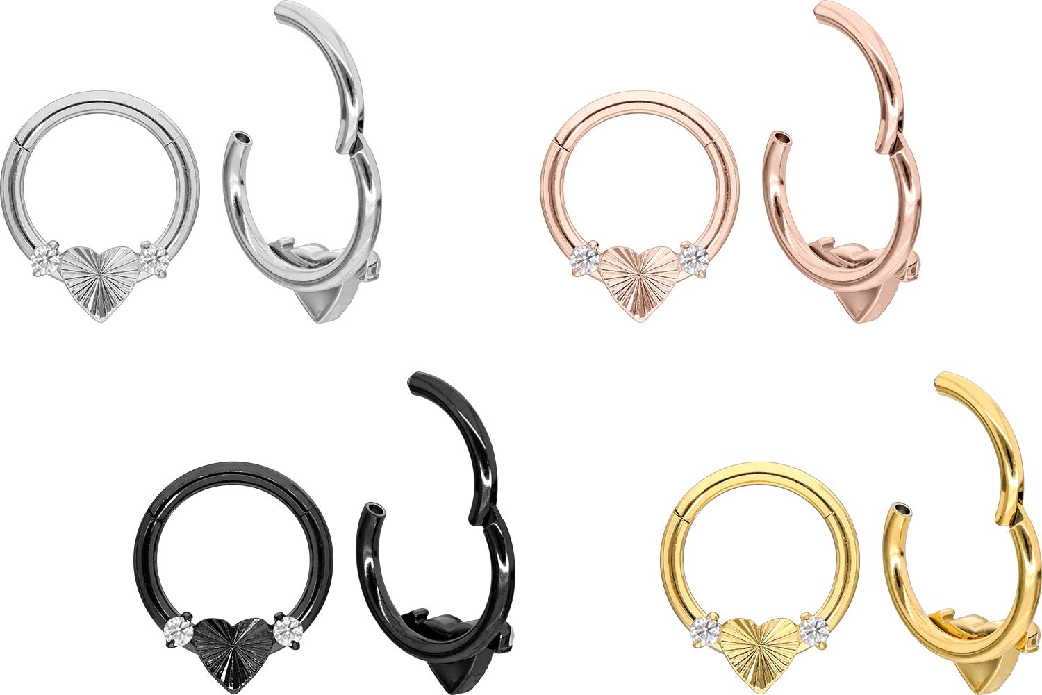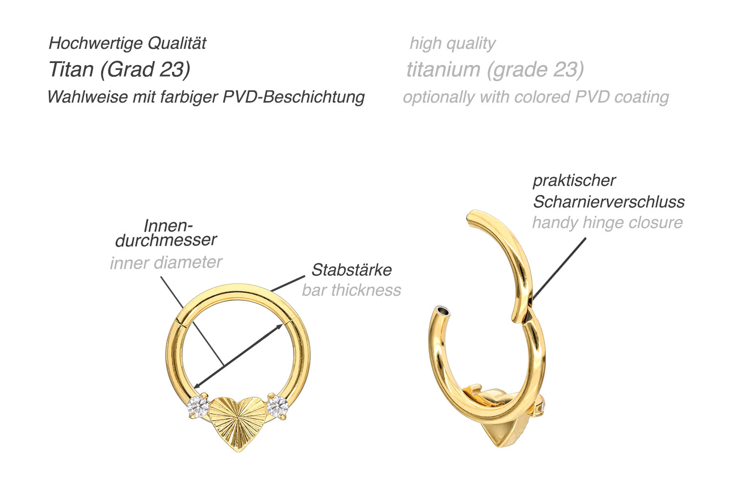 Easy handling and gorgeous design - that is what our clickers are all about! The main feature of the clickers is the practical hinge, which simplifies the insertion. The material used for manufacturing (titanium grade 23) is characterized by its good skin compatibility, high quality and durability. Depending on the desired color, the piercing is covered with a scratch-resistant PVD coating. As a special highlight, the design reminding of a heart, which is surrounded by two crystals, adorns the piece of jewelry. Whether at the ear, the nose or the lip - our clickers are suitable for a variety of different piercing locations. This clicker has a bar thickness of 1.2 mm, while its available inner diameter is 8 mm.Material: titanium (grade 23)