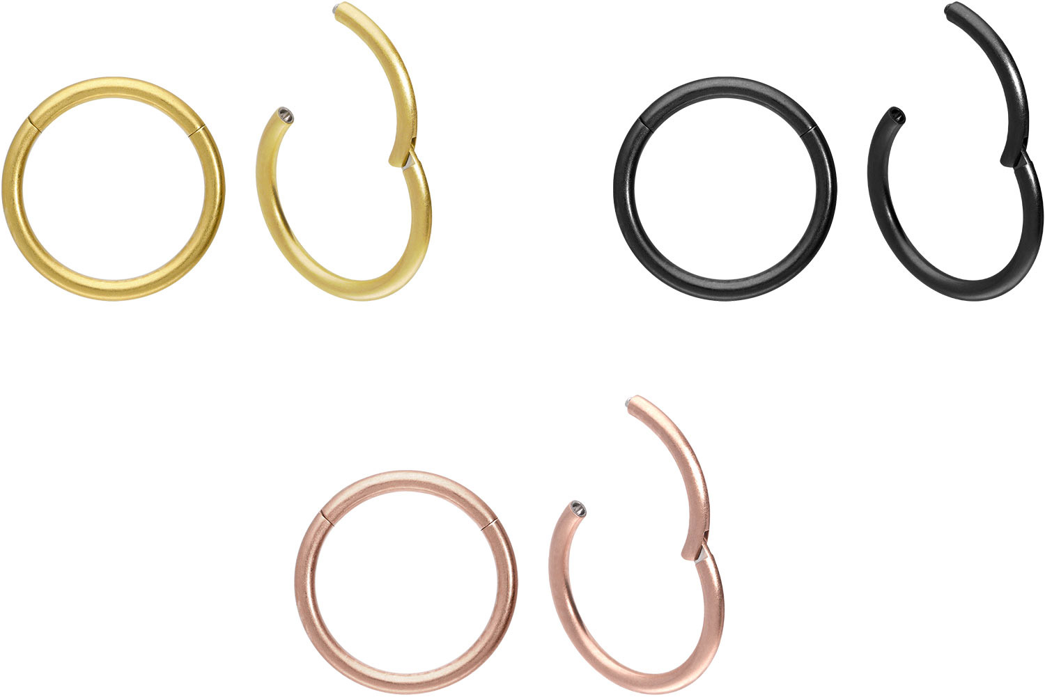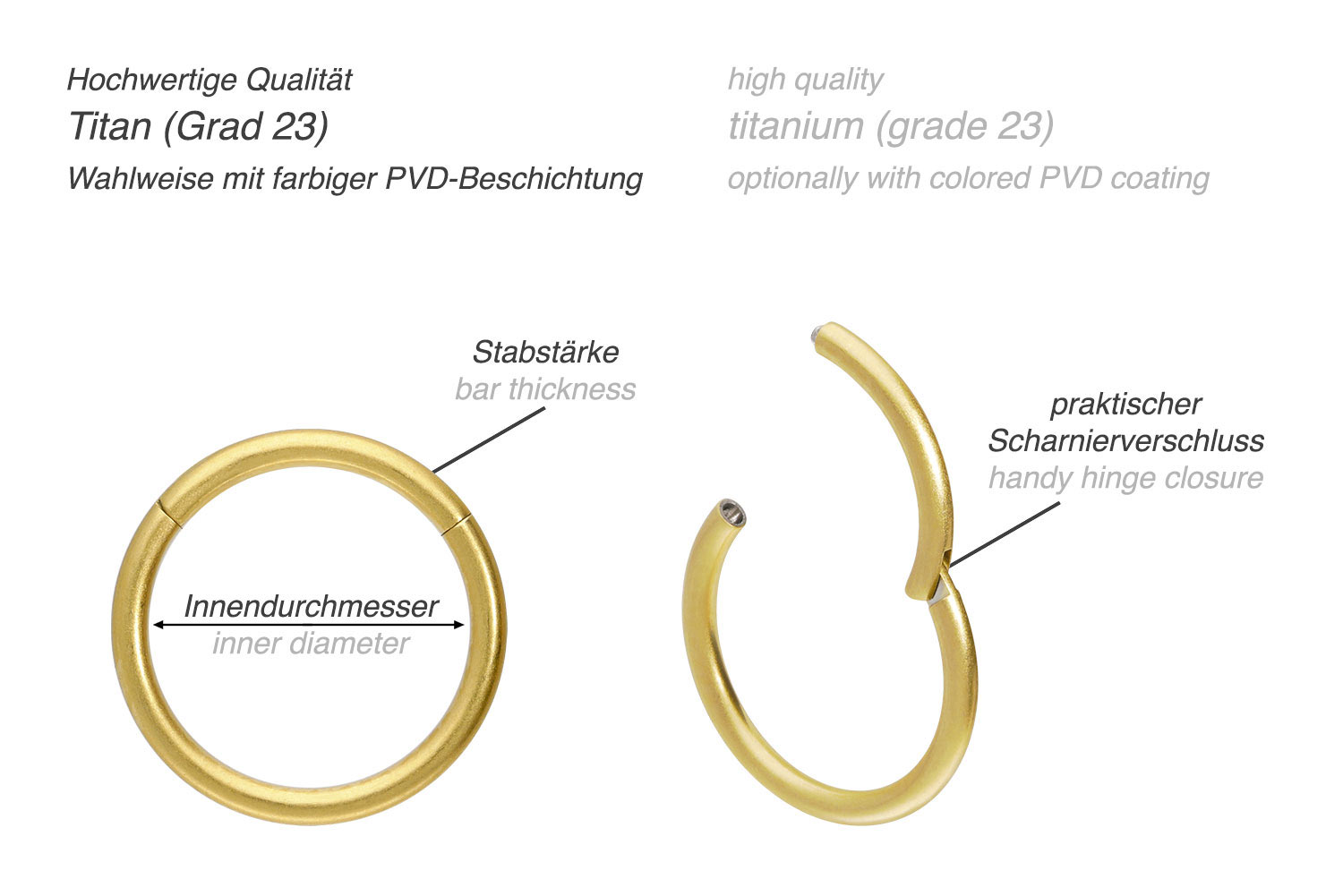 Easy handling and gorgeous design - that is what our clickers are all about! The main feature of the clickers is the practical hinge, which simplifies the insertion. The material used for manufacturing (titanium grade 23) is characterized by its good skin compatibility, high quality and durability. This piercing is covered with a scratch-resistant PVD coating. Its just as timelessly beautiful as matt design is a genuine eye-catcher. Whether at the ear, the nose or the lip - our clickers are suitable for a variety of different piercing locations. This classic clicker is available with the bar thicknesses and inner diameters listed below.