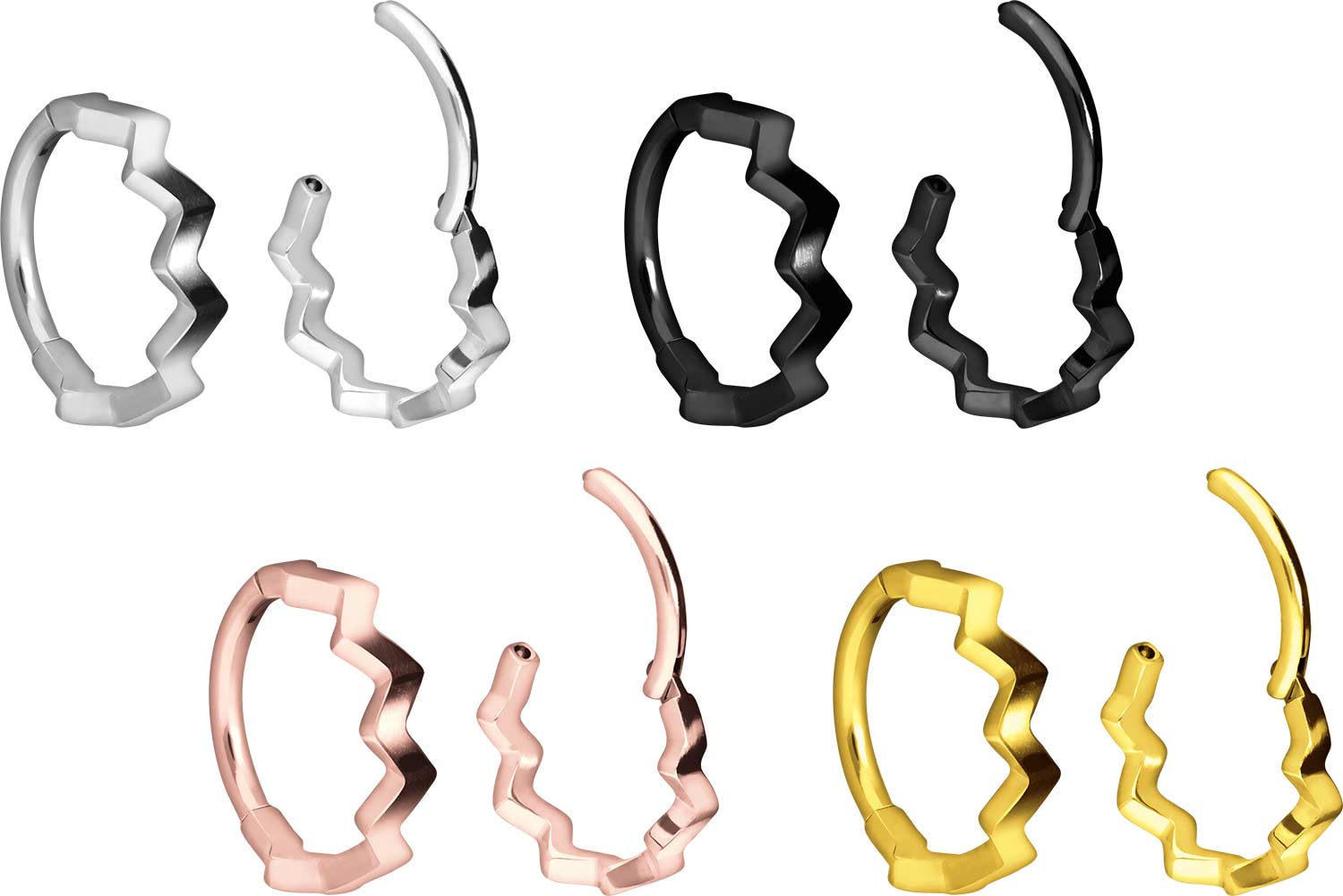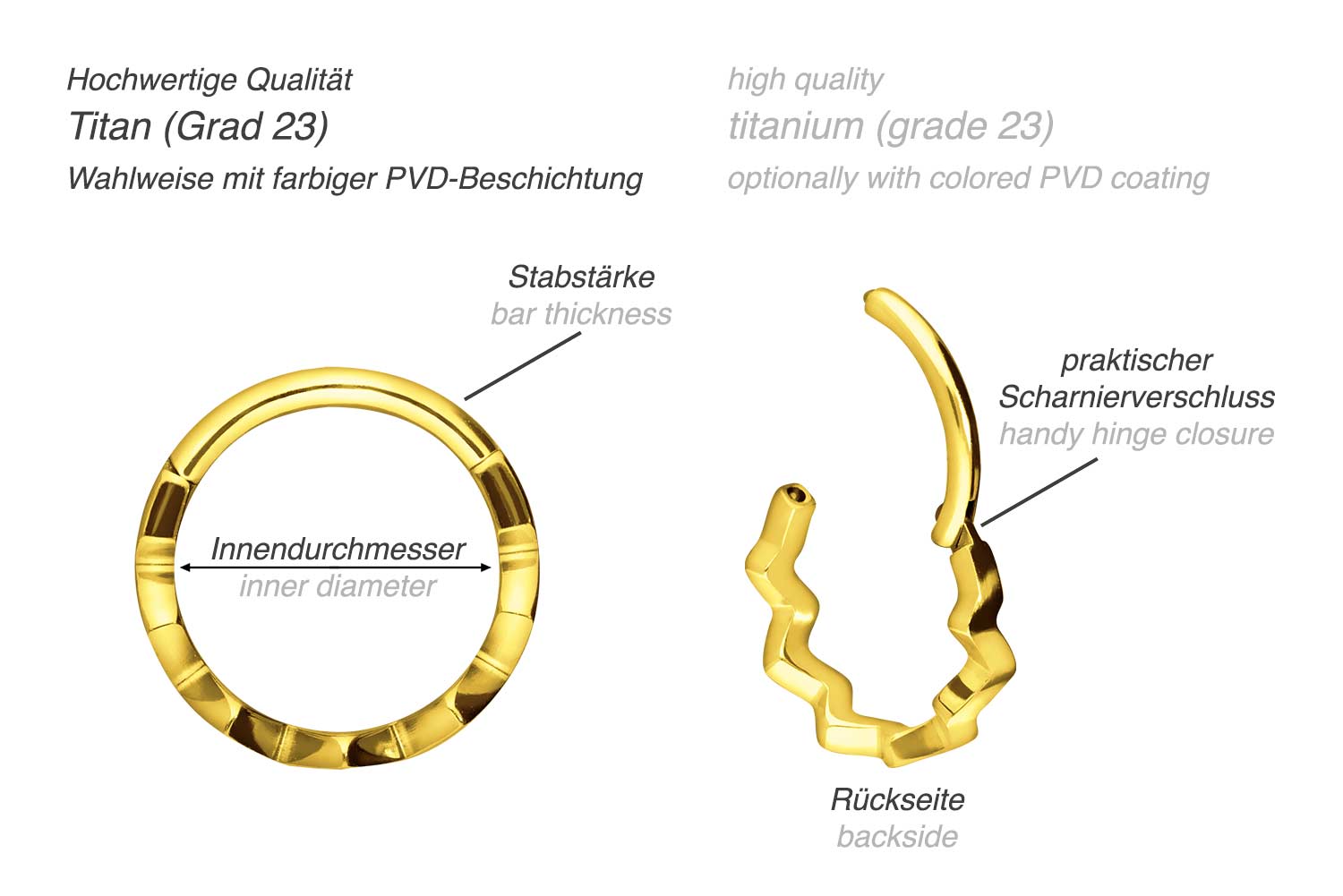 Easy handling and gorgeous design - that is what our clickers are all about! The main feature of the clickers is the practical hinge, which simplifies the insertion. The material used for manufacturing (titanium grade 23) is characterized by its good skin compatibility, high quality and durability. Depending on the desired color, the piercing is covered with a scratch-resistant PVD coating. Particularly appealing is the piece of jewelry due to its serrated design. Whether at the ear, the nose or the lip - our clickers are suitable for a variety of different piercing locations. This clicker has a bar thickness of 1.2 mm, while its available inner diameters are listed below.Material: titanium (grade 23)