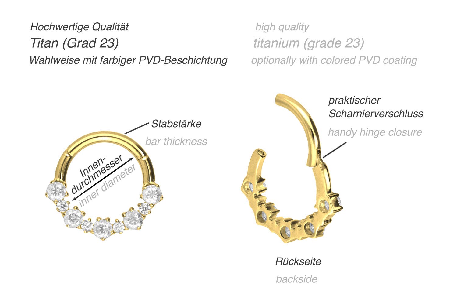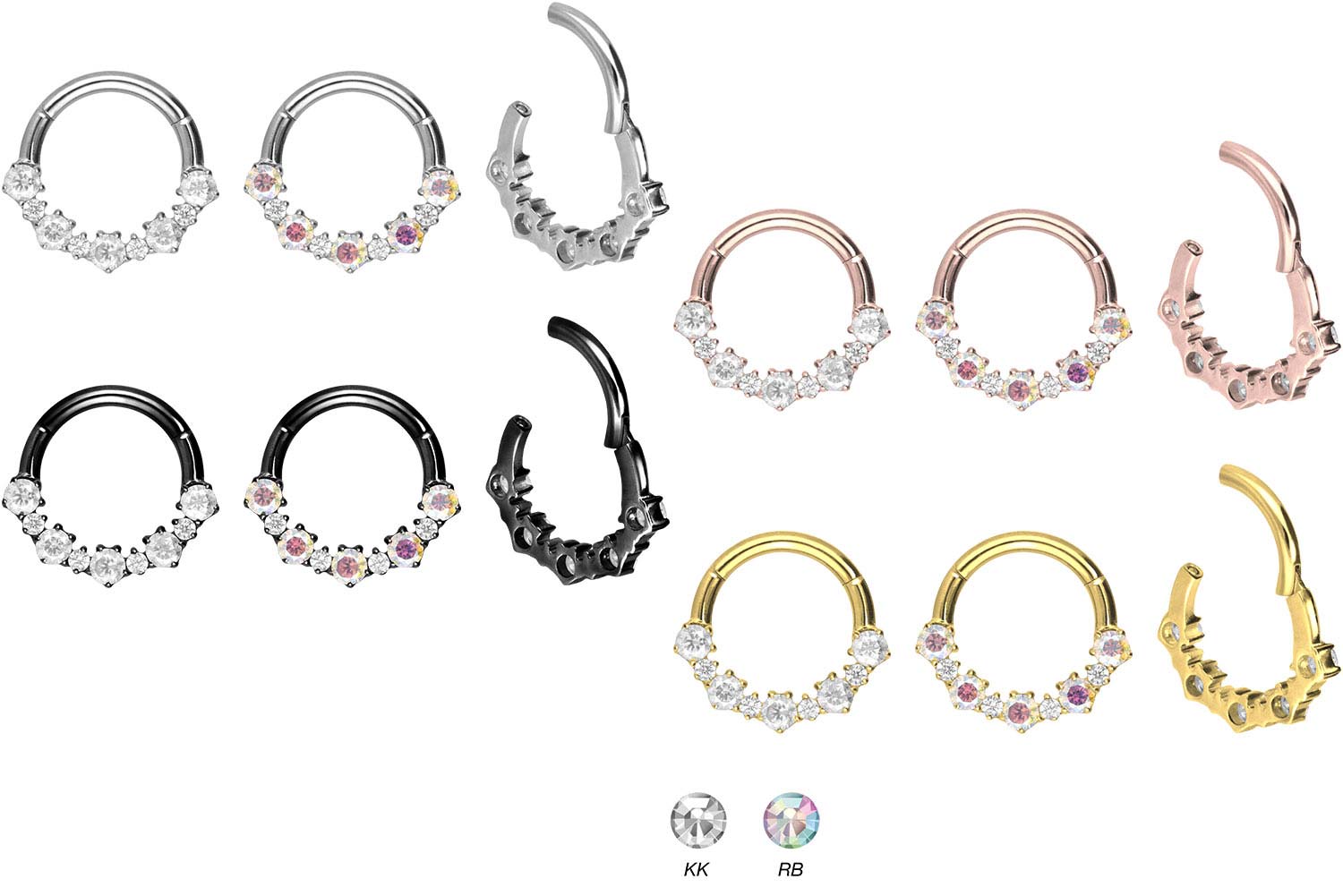 Easy handling and gorgeous design - that is what our clickers are all about! The main feature of the clickers is the practical hinge, which simplifies the piercing's insertion. The material used for manufacturing (titanium grade 23) is characterized by its good skin compatibility, high quality and durability. Depending on the desired color, the piercing is covered with a scratch-resistant PVD coating. The wonderfully shimmering crystals with settings let this piece of jewelry shine in all its glory. Whether at the ear, the nose or the lip - our clickers are suitable for a variety of different piercing locations. The clicker's bar thickness is 1.2 mm, while its available inner diameters are listed below.Material: titanium (grade 23)