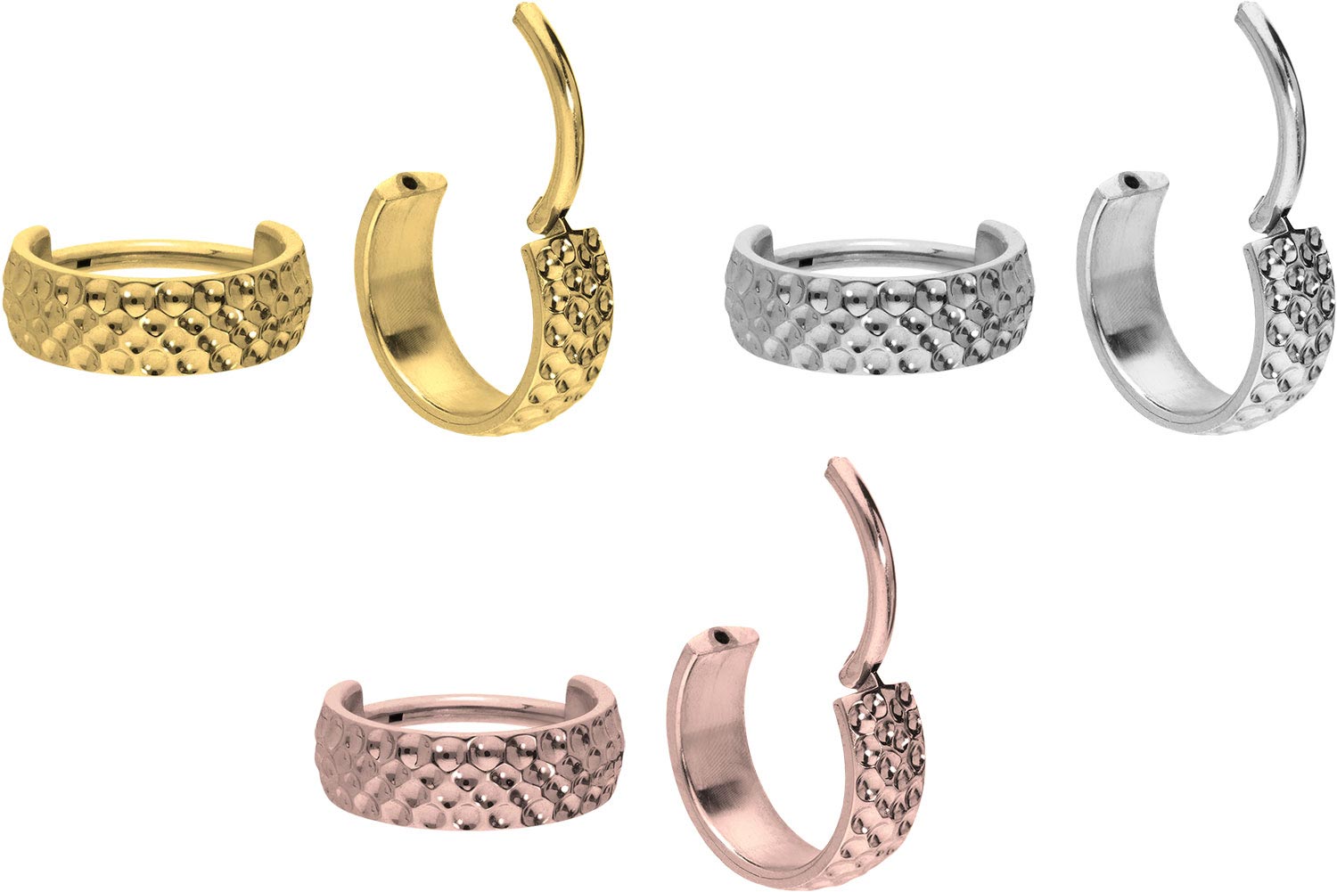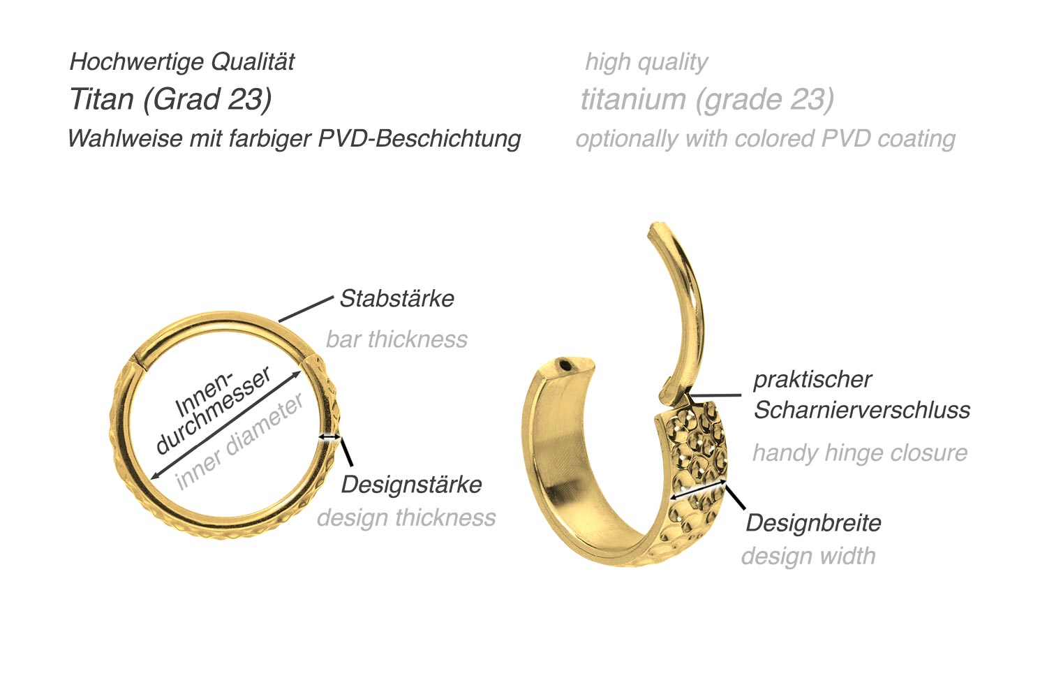Easy handling and gorgeous design - that is what our clickers are all about! The main feature of the clickers is the practical hinge, which simplifies the insertion. The material used for manufacturing (titanium grade 23) is characterized by its good skin compatibility, high quality and durability. Depending on the desired color, the piercing is covered with a scratch-resistant PVD coating. Particularly appealing is the piece of jewelry due to its extravagant design, which is reminiscent of a hammered texture. Whether at the ear, the nose or the lip - our clickers are suitable for a variety of different piercing locations. This clicker has a bar thickness of 1.2 mm, while its available inner diameters are listed below.Material: titanium (grade 23)
