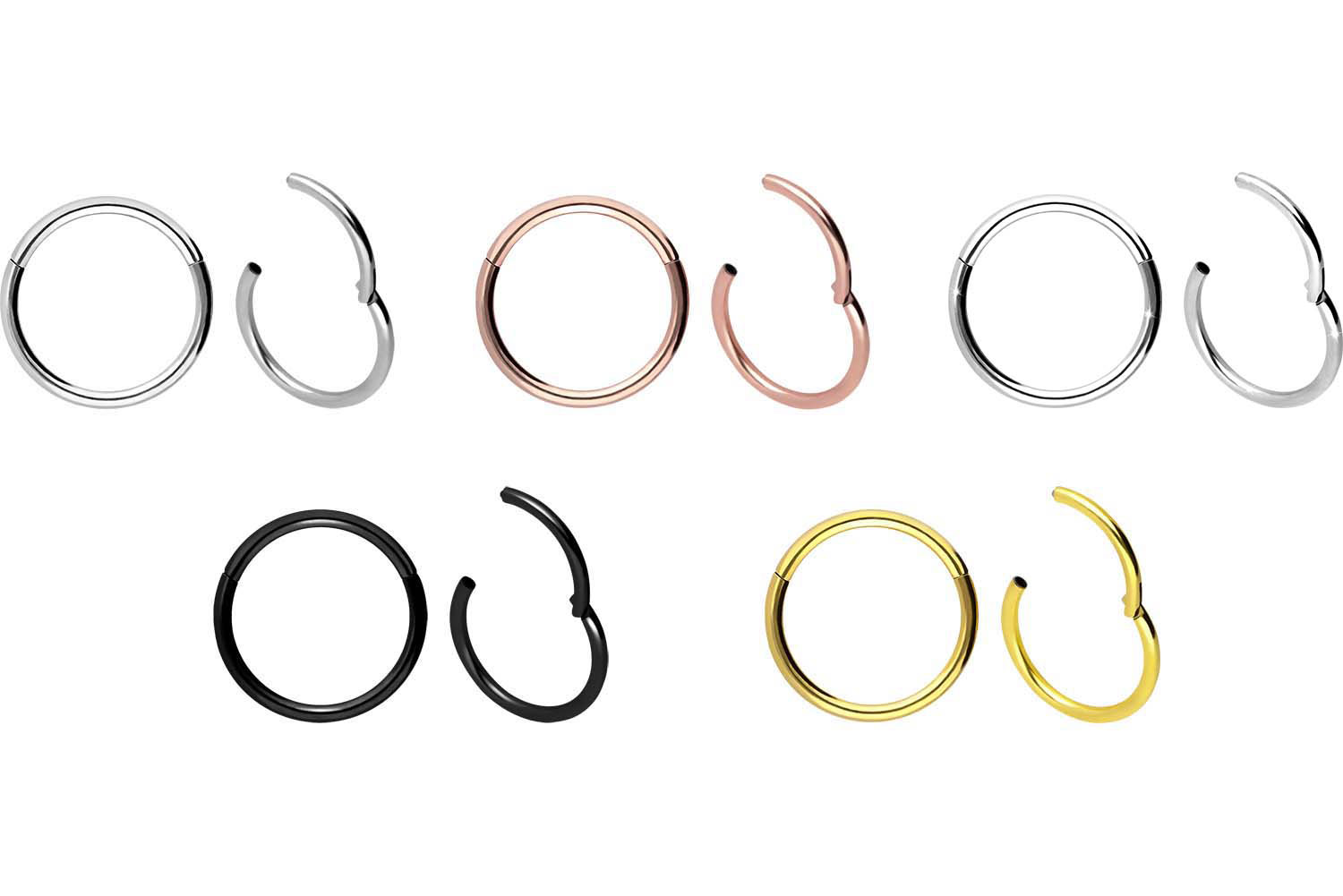 Easy handling and gorgeous design - that is what our clickers are all about! The main feature of the clickers is the practical hinge, which simplifies the piercing's insertion. The material used for manufacturing (titanium grade 23) is characterized by its good skin compatibility, high quality and durability. Depending on the desired color the piercing is covered with a scratch-resistant PVD coating. Particularly noteworthy is the whitegold-colored PVD coating which gives the clicker a bright silvery shine. Its just as timelessly beautiful as plain design is a genuine eye-catcher. Whether at the ear, the nose or the lip - our clickers are suitable for a variety of different piercing locations. This classic clicker is available with the bar thicknesses and inner diameters listed below. With a bar thickness of 0.6 mm (especially suitable for nose piercings), the design thickness is 1 mm.