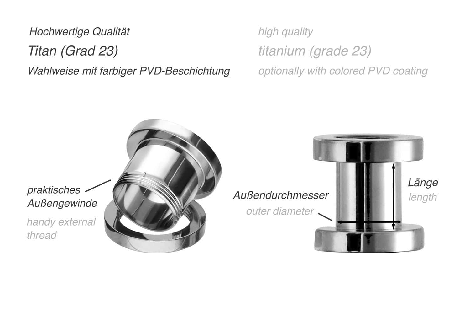 This classic tunnel is made of first-class titanium, which, in addition to its excellent quality, also convinces with properties such as good skin compatibility and high material durability. If desired, a scratch-resistant PVD coating provides a strong color, further enhanced by the highly polished surface. In addition, the one-sided unscrewable edge of the tunnel ensures a particularly good fit in the ear. The item is available in the outer diameters listed below.