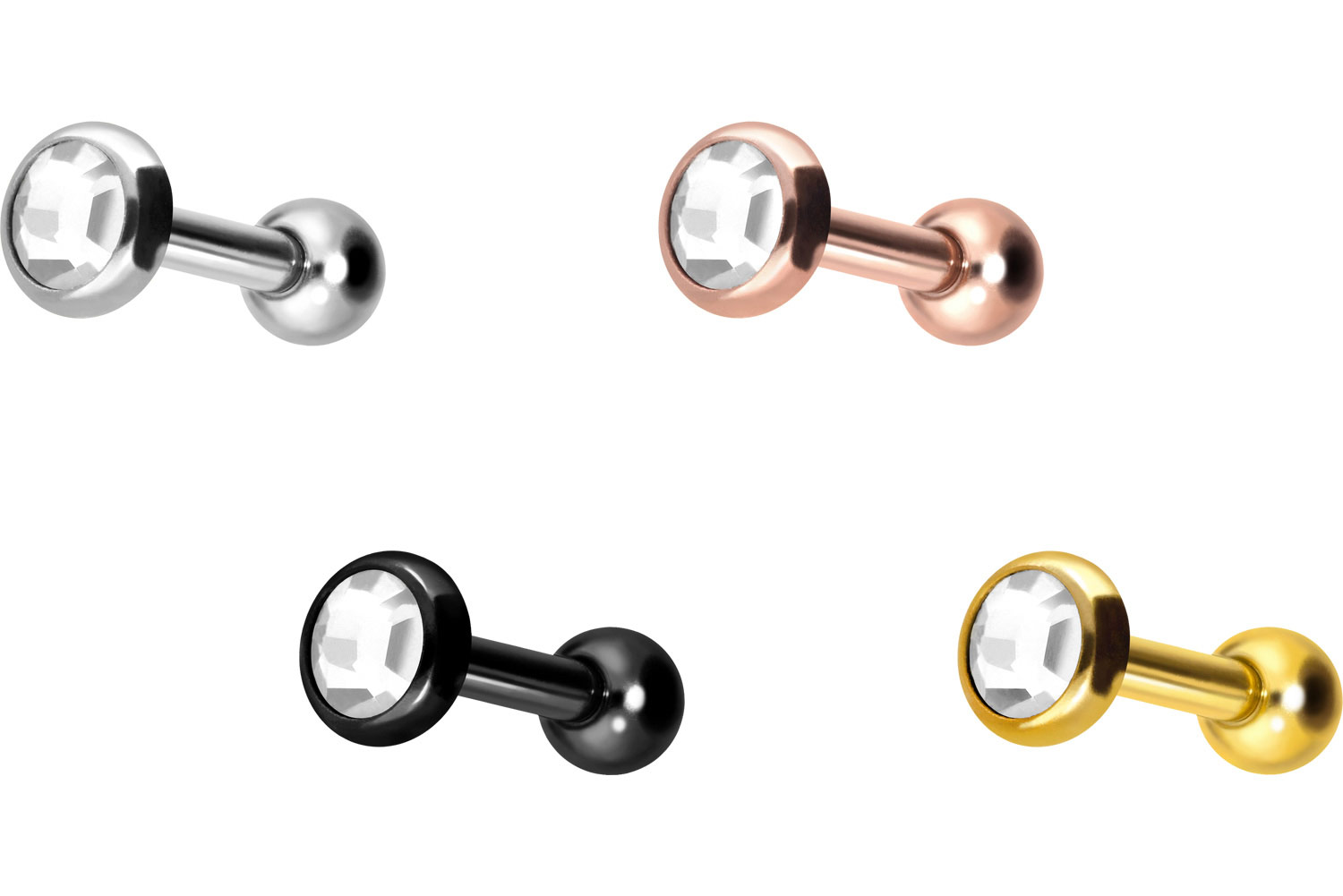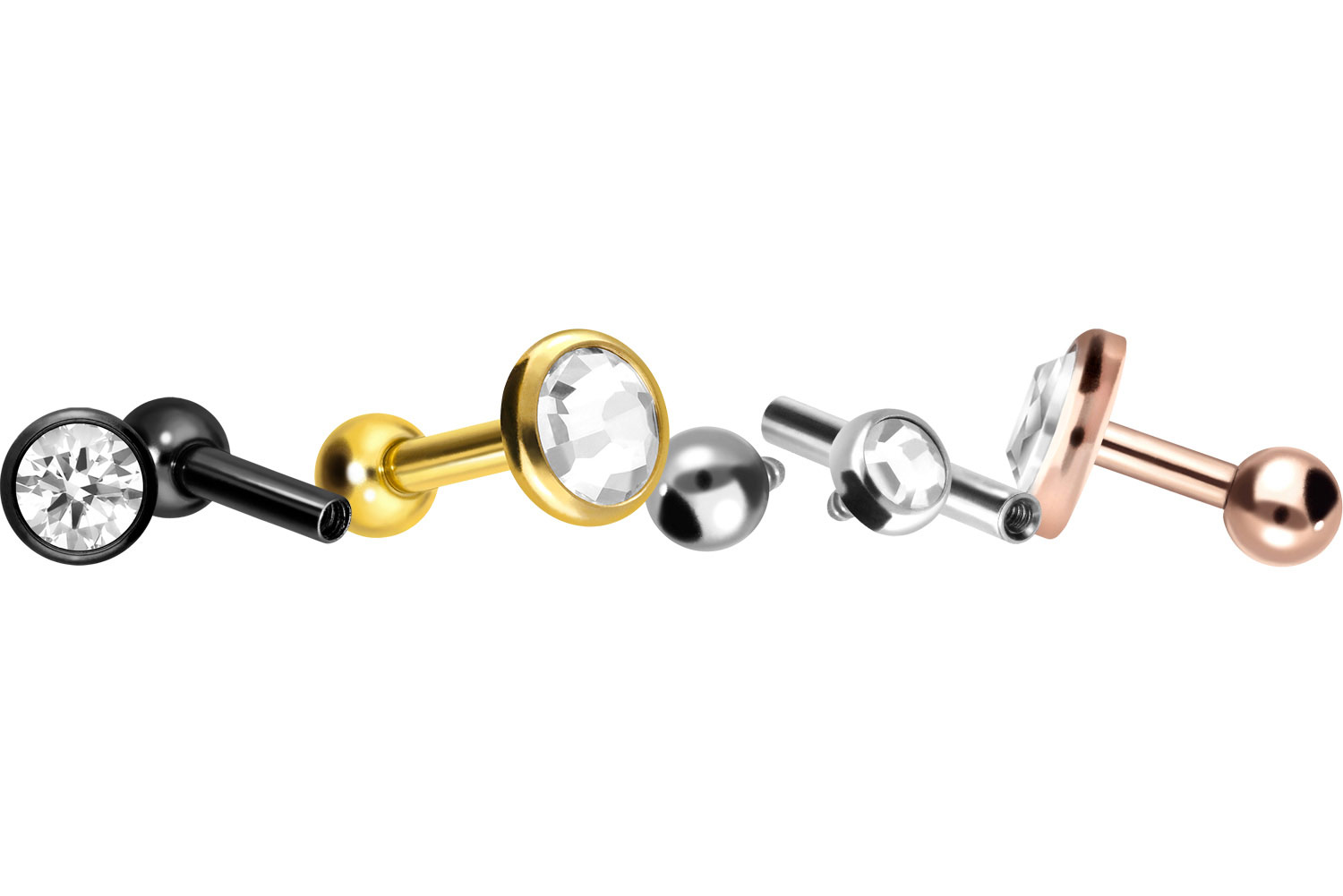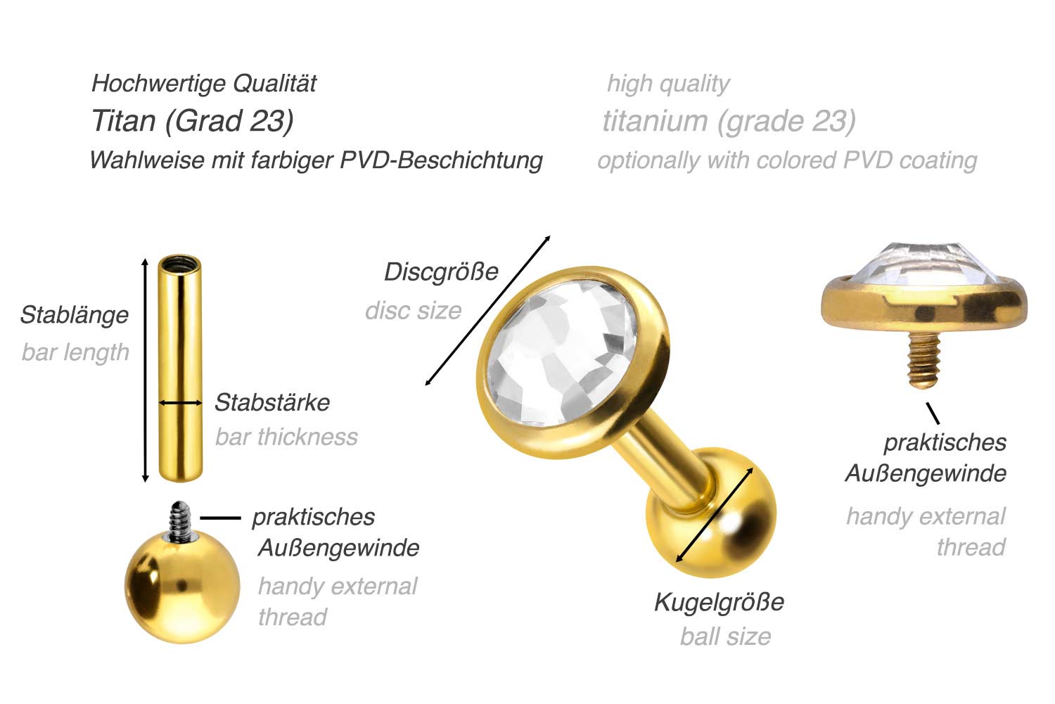 also guaranteed in the colored versions with PVD coating. Thanks to the appealing design, consisting of a timelessly beautiful screw-in attachment with external thread in form of a ............., the piece of jewelry acquires a unique charm. The ear piercing has a bar thickness of 1.2 mm and a bar length of either 6 or 8 mm.