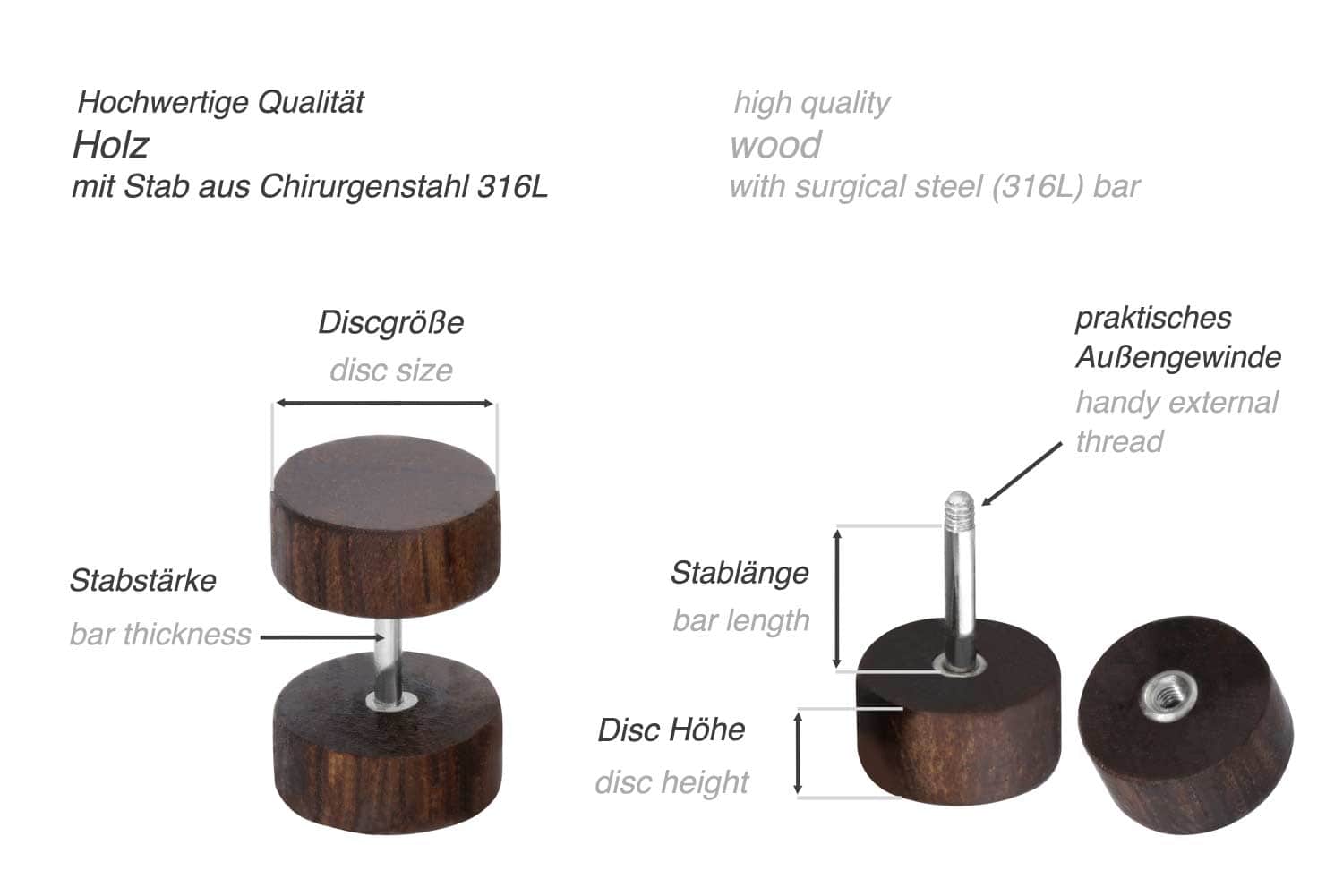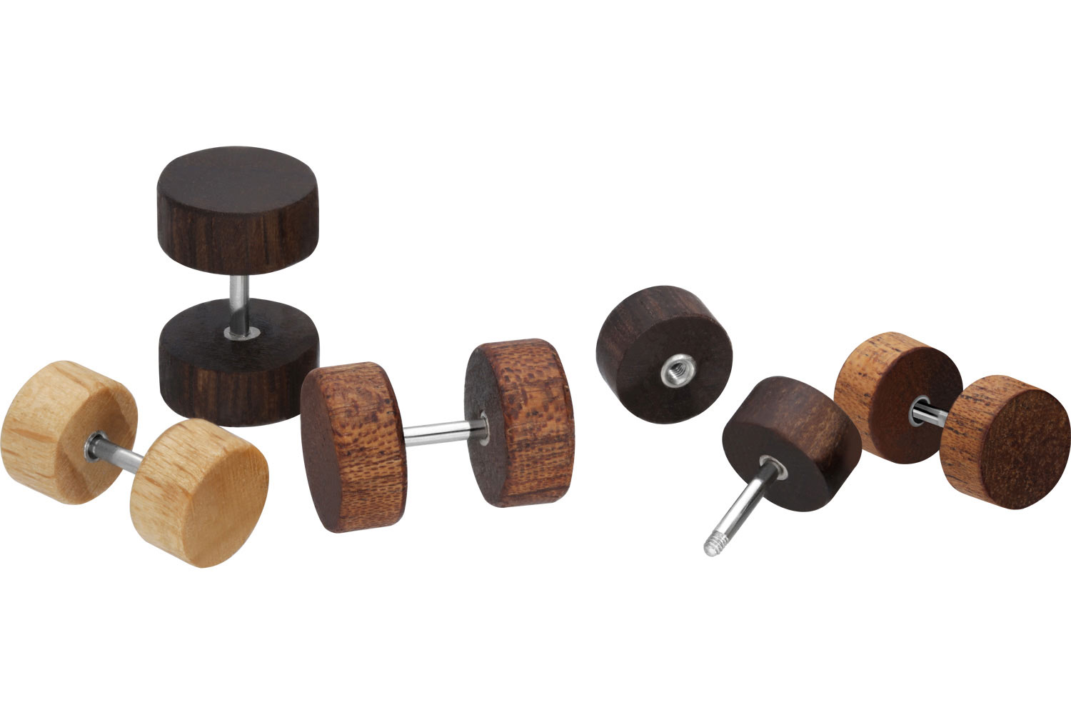 With the exception of the surgical steel 316L bar, this fake plug is entirely made of either beech, mahogany or walnut wood. All three of these different types of wood have advantageous properties such as good skin