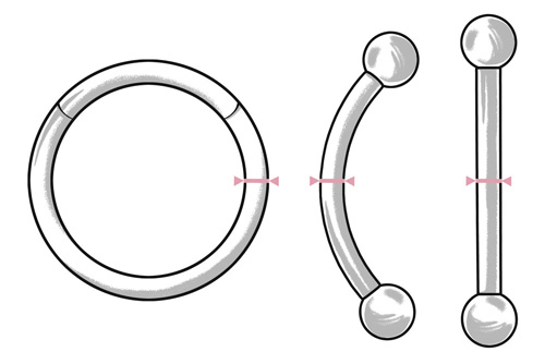 For the bar thickness, always choose the same size as the piercing puncture or the next smaller one (but never a larger one, unless the puncture is to be deliberately stretched).