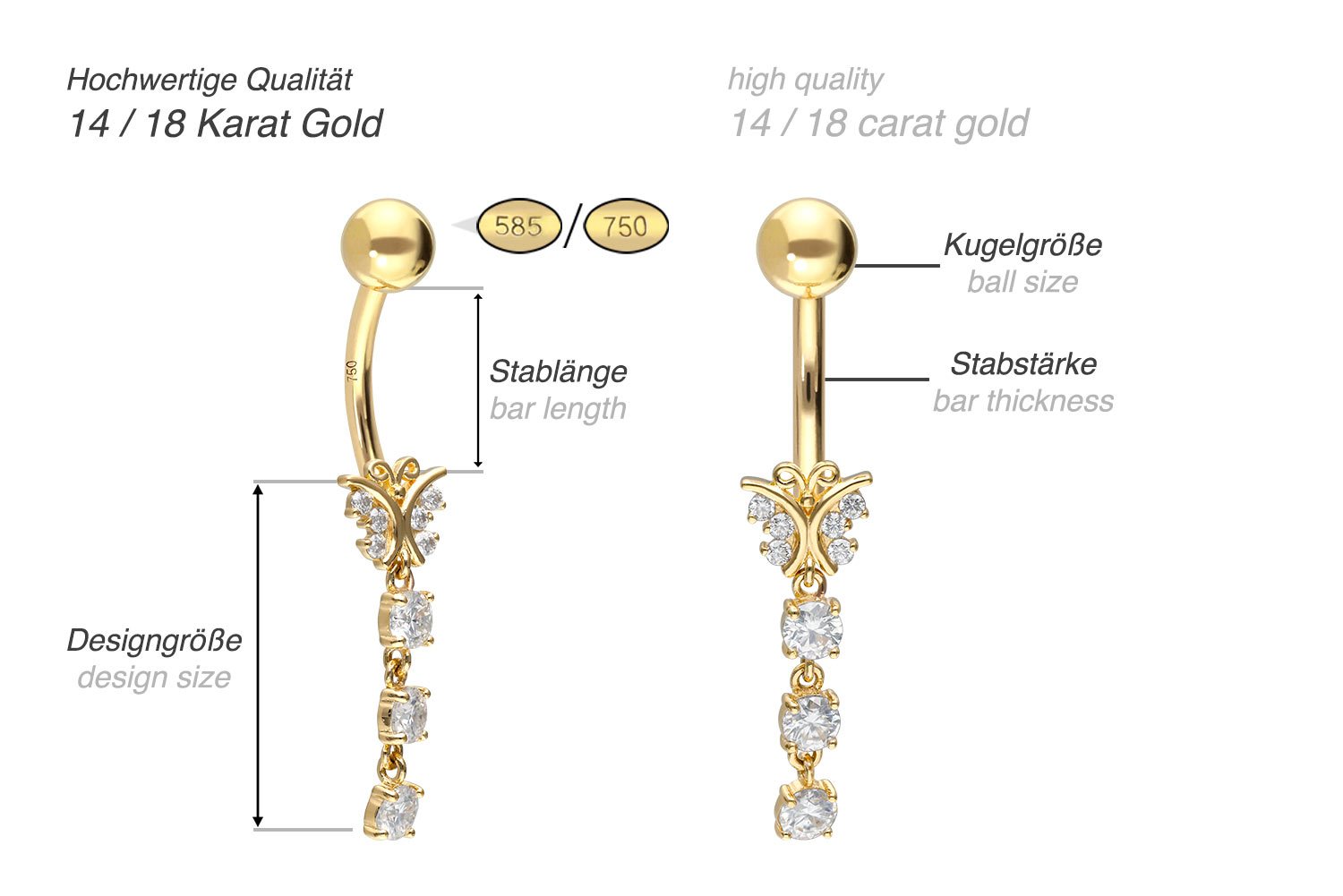 Dieses edle Bananabell besteht mit Ausnahme der Moissanite vollständig aus hochwertigem 14 Karat (585er) oder 18 Karat (750er) Gelbgold, das neben seiner exzellenten Qualität auch mit Eigenschaften wie guter Hautverträglichkeit und hoher Beständigkeit zu begeistern weiß. Der Moissanit verleiht dem Schmuckstück seinen außergewöhnlichen, diamantenähnlichen Glanz. Jeder Einzelne unserer Artikel aus Gold wird mit viel Liebe zum Detail in Handarbeit gefertigt und ist somit ein Unikat. Die obere Kugel dieses bezaubernden Bananabells kann abgeschraubt werden, während der Schmetterling mit den drei beweglichen Moissaniten fest mit dem Stab verbunden ist. Besagter Stab verfügt über eine Stärke von 1,6 mm sowie einer Länge von 10 mm.