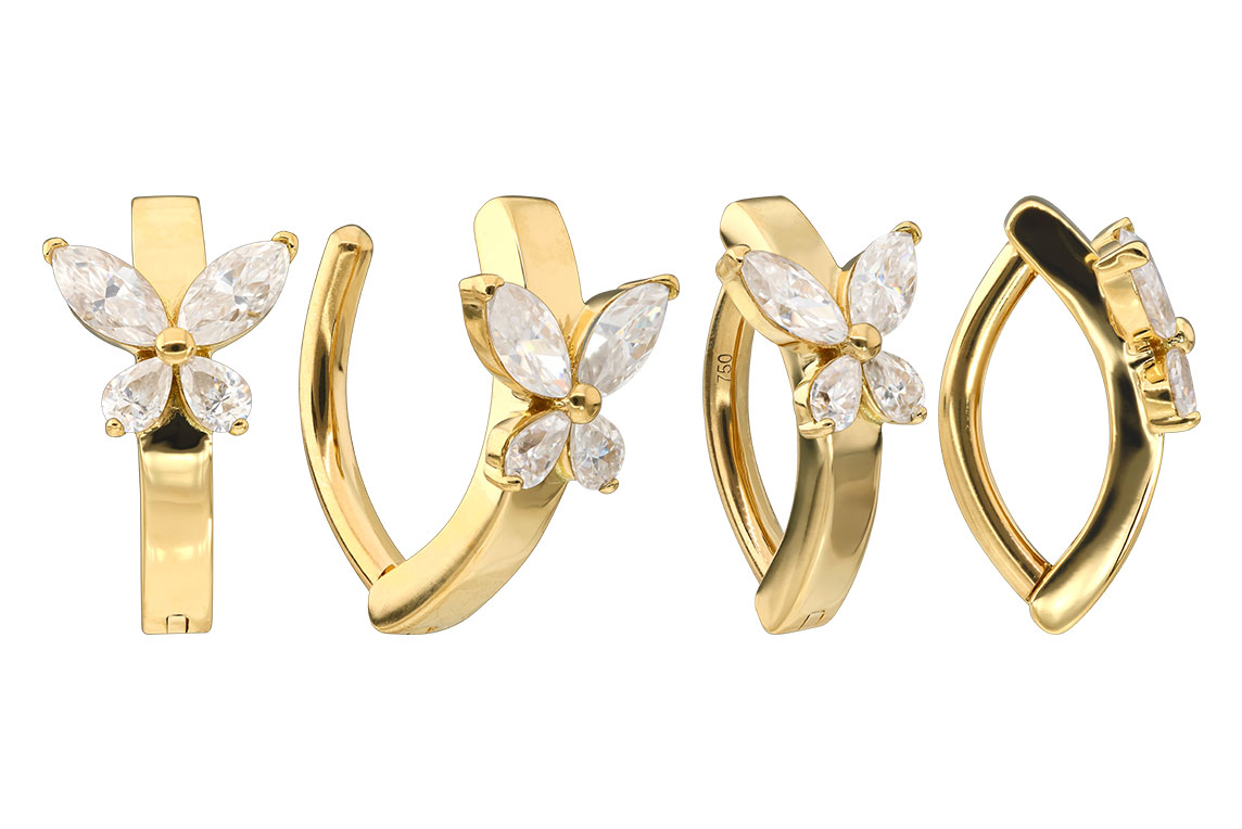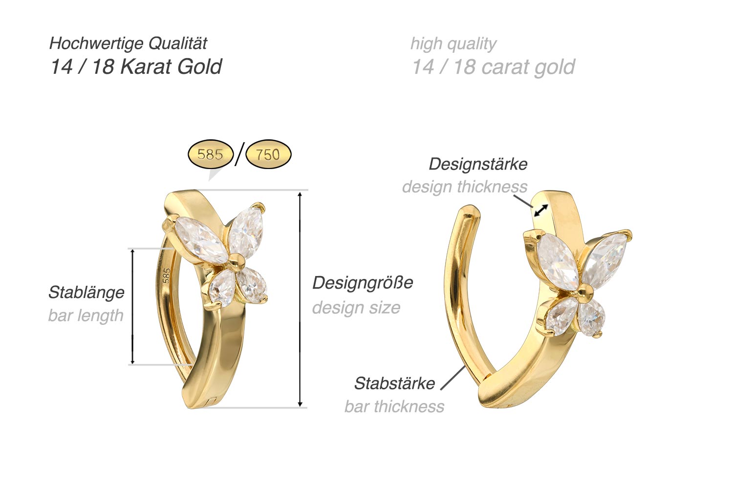 Einfache Handhabung und schönes Design - das sind unsere Clicker! Als Hauptmerkmal der Clicker zählt das praktische Scharnier, das den Einsatz in den Stichkanal enorm erleichtert. Dieser edle Bauchnabelclicker besteht mit Ausnahme der Moissanite vollständig aus hochwertigem 14 Karat (585er) oder 18 Karat (750er) Gelbgold, das neben seiner exzellenten Qualität auch mit Eigenschaften wie guter Hautverträglichkeit und hoher Beständigkeit zu begeistern weiß. Der Moissanit verleiht dem Schmuckstück seinen außergewöhnlichen, diamantenähnlichen Glanz. Jeder Einzelne unserer Artikel aus Gold wird mit viel Liebe zum Detail in Handarbeit gefertigt und ist somit ein Unikat. Ebenso schlicht wie elegant ist der mit einem Moissanit-Schmetterling bestückte Bogen, der das Design ausmacht. Das Schmuckstück hat eine Stabstärke von 1,6 mm und ist mit einer Stablänge von 10 mm erhältlich.