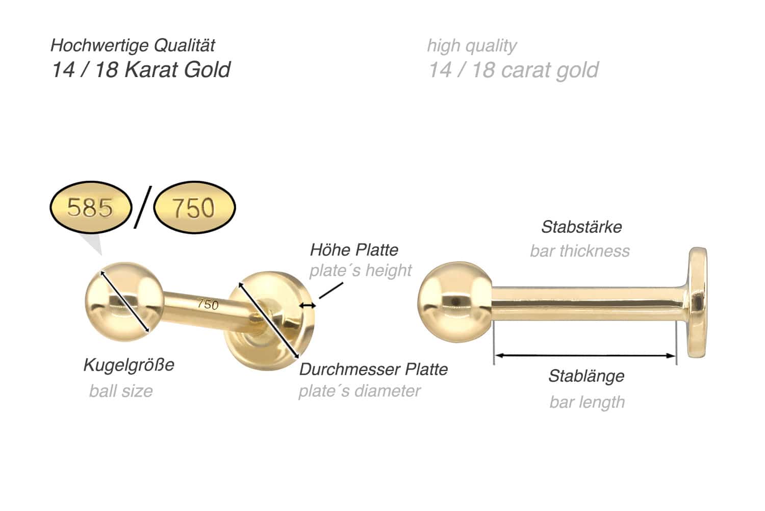 Dieses edle Labret besteht vollständig aus hochwertigem 14 Karat (585er) oder 18 Karat (750er) Gold, das