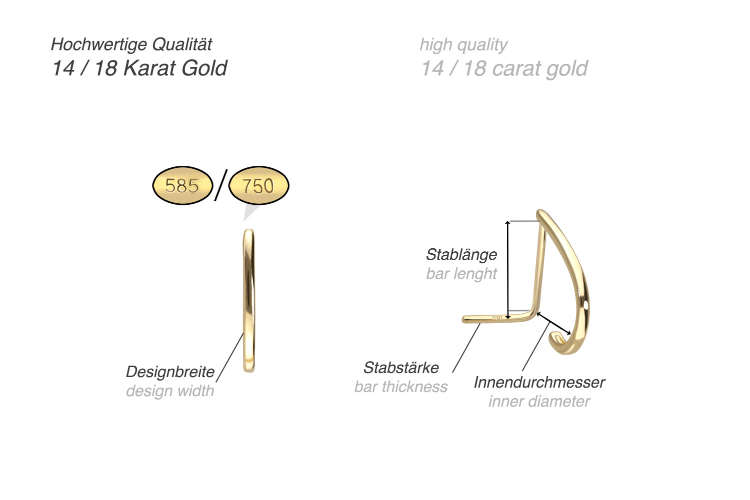 Dieser Nasenstecker besteht vollständig aus hochwertigem 14 Karat (585er) oder 18 Karat (750er) Gelbgold, das neben seiner exzellenten Qualität auch mit Eigenschaften wie guter Hautverträglichkeit und hoher Beständigkeit zu begeistern weiß. Jeder Einzelne unserer Artikel aus Gold wird mit viel Liebe zum Detail in Handarbeit gefertigt und ist somit ein Unikat. Dank des L-förmigen Stabes dieses Schmuckstücks wird ein besonders fester Halt in der Nase gewährleistet. Zeitlgleich erinnert das von außen sichtbare schmale Design an einen geschlossenen Nasenring. Es verfügt stets über eine Stabstärke von 0,6 mm, wohingegen die Stablänge 7 mm beträgt.
