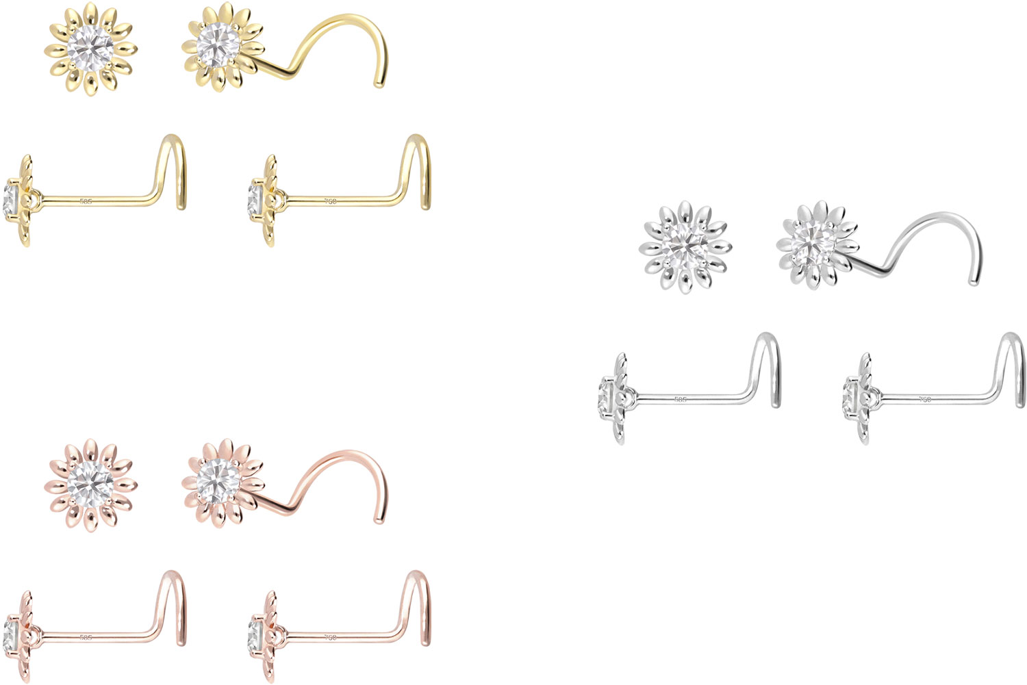 Dieser Nasenstecker mit dem Design in Form einer Blume besteht mit Ausnahme des Moissanits vollständig aus hochwertigem 14 Karat (585er) oder 18 Karat (750er) Gold, das neben seiner exzellenten Qualität auch mit Eigenschaften wie guter Hautverträglichkeit und hoher Beständigkeit zu begeistern weiß. Farblich ist er in Gelbgold, Roségold und rhodiniertem Weißgold erhältlich. Der Moissanit verleiht dem Schmuckstück seinen außergewöhnlichen, diamantenähnlichen Glanz. Jeder Einzelne unserer Artikel aus Gold wird mit viel Liebe zum Detail in Handarbeit gefertigt und ist somit ein Unikat. Dank des spiralförmigen Stabes dieses Schmuckstücks wird ein besonders fester Halt in der Nase gewährleistet. Es verfügt stets über eine Stabstärke von 0,6 mm, wohingegen die Stablänge 6 mm beträgt.