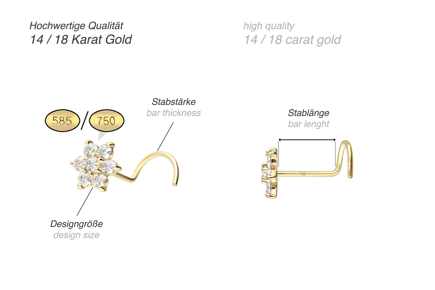 Dieser Nasenstecker mit dem Design in Form einer Blume besteht mit Ausnahme der Moissanite vollständig aus hochwertigem 14 Karat (585er) oder 18 Karat (750er) Gold, das neben seiner exzellenten Qualität auch mit Eigenschaften wie guter Hautverträglichkeit und hoher Beständigkeit zu begeistern weiß. Farblich ist er in Gelbgold, Roségold und rhodiniertem Weißgold erhältlich. Der Moissanit verleiht dem Schmuckstück seinen außergewöhnlichen, diamantenähnlichen Glanz. Jeder Einzelne unserer Artikel aus Gold wird mit viel Liebe zum Detail in Handarbeit gefertigt und ist somit ein Unikat. Dank des spiralförmigen Stabes dieses Schmuckstücks wird ein besonders fester Halt in der Nase gewährleistet. Es verfügt stets über eine Stabstärke von 0,6 mm, wohingegen die Stablänge 6 mm beträgt.
