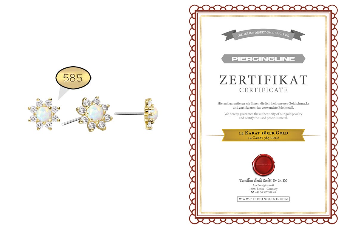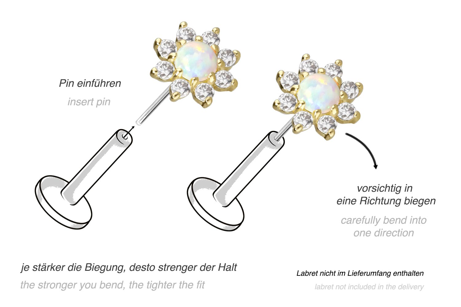 Dieser zeitlos schöne Push Pin Aufsatz in Form einer Blume besteht mit Ausnahme der Moissanite und der synthetischen Opale vollständig aus hochwertigem 14 Karat (585er) Gold, das neben seiner exzellenten Qualität auch mit Eigenschaften wie guter Hautverträglichkeit und hoher Beständigkeit zu begeistern weiß. Lediglich der Push Pin ist aus Titan (Grad 23) gefertigt. Farblich ist er in Gelbgold, Roségold und rhodiniertem Weißgold erhältlich. Der Moissanit verleiht dem Schmuckstück seinen außergewöhnlichen, diamantenähnlichen Glanz. Jeder Einzelne unserer Artikel aus 14-karätigem Gold wird mit viel Liebe zum Detail in Handarbeit gefertigt und ist somit ein Unikat. Zum Einsetzen muss der Pin nach Belieben gebogen werden. Es ist zu beachten, dass ein festerer Halt gewährleistet ist, wenn der Pin ein bisschen stärker gebogen wird. Der Push Pin des Aufsatzes ist mit all unseren 14 Karat (585er) Gold Produkten mit Push Fit kompatibel, sodass sich vielfältige Kombinationsmöglichkeiten ergeben.
