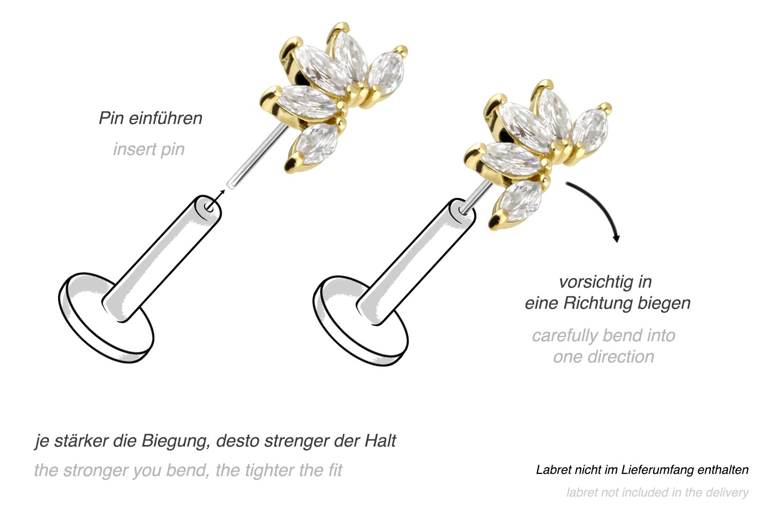 Dieser zeitlos schöne Push Pin Aufsatz in Form einer Lotusblüte besteht mit Ausnahme der Moissanite vollständig aus hochwertigem 14 Karat (585er) Gold, das neben seiner exzellenten Qualität auch mit Eigenschaften wie guter Hautverträglichkeit und hoher Beständigkeit zu begeistern weiß. Lediglich der Push Pin ist aus Titan (Grad 23) gefertigt. Farblich ist er in Gelbgold, Roségold und rhodiniertem Weißgold erhältlich. Der Moissanit verleiht dem Schmuckstück seinen außergewöhnlichen, diamantenähnlichen Glanz. Jeder Einzelne unserer Artikel aus 14-karätigem Gold wird mit viel Liebe zum Detail in Handarbeit gefertigt und ist somit ein Unikat. Zum Einsetzen muss der Pin nach Belieben gebogen werden. Es ist zu beachten, dass ein festerer Halt gewährleistet ist, wenn der Pin ein bisschen stärker gebogen wird. Der Push Pin des Aufsatzes ist mit all unseren 14 Karat (585er) Gold Produkten mit Push Fit kompatibel, sodass sich vielfältige Kombinationsmöglichkeiten ergeben.