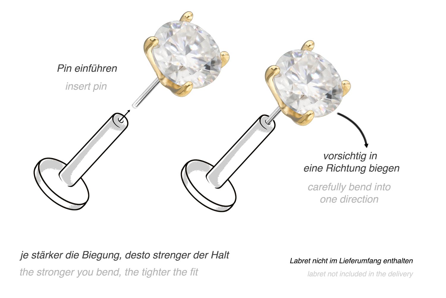 Dieser zeitlos schöne Push Pin Aufsatz besteht mit Ausnahme des Moissanits vollständig aus hochwertigem 14 Karat (585er) Gold, das neben seiner exzellenten Qualität auch mit Eigenschaften wie guter Hautverträglichkeit und hoher Beständigkeit zu begeistern weiß. Lediglich der Push Pin ist aus Titan (Grad 23) gefertigt. Farblich ist er in Gelbgold, Roségold und rhodiniertem Weißgold erhältlich. Der Moissanit verleiht dem Schmuckstück seinen außergewöhnlichen, diamantenähnlichen Glanz. Jeder Einzelne unserer Artikel aus Gold wird mit viel Liebe zum Detail in Handarbeit gefertigt und ist somit ein Unikat. Zum Einsetzen muss der Pin nach Belieben gebogen werden. Es ist zu beachten, dass ein festerer Halt gewährleistet ist, wenn der Pin ein bisschen stärker gebogen wird. Der Push Pin des Aufsatzes ist mit all unseren 14 Karat (585er) Gold Produkten mit Push Fit kompatibel, sodass sich vielfältige Kombinationsmöglichkeiten ergeben.