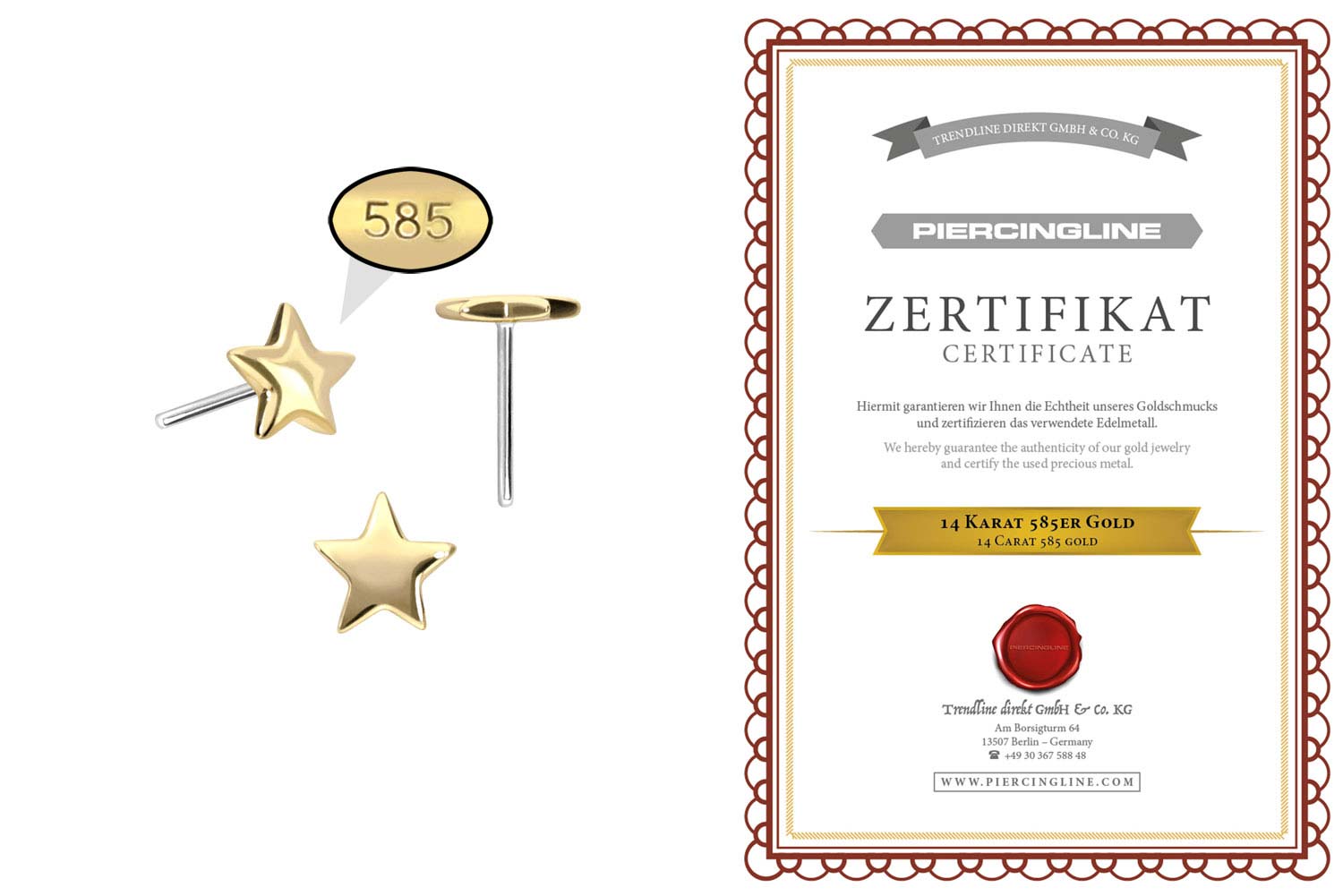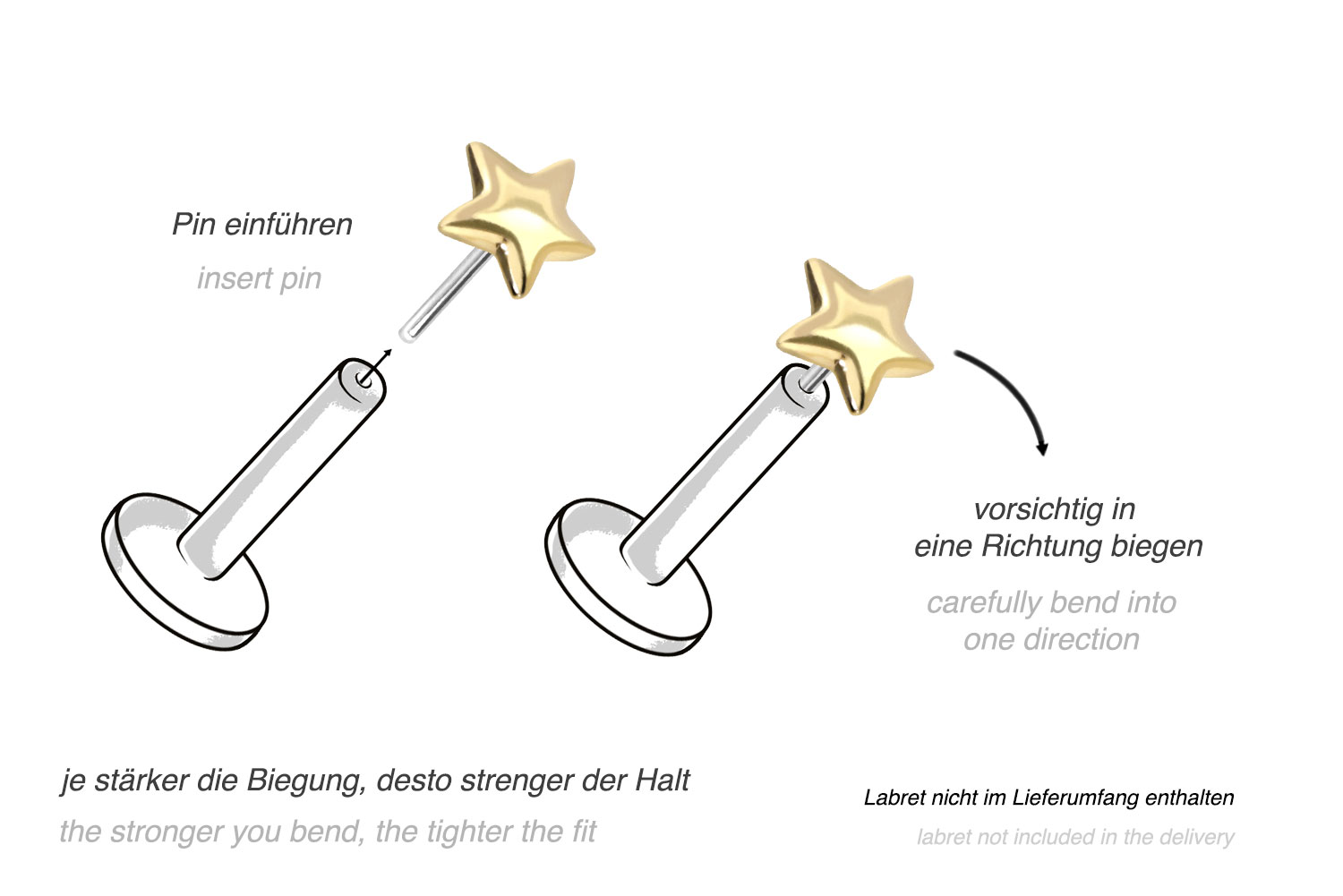 Dieser zeitlos schöne Push Pin Aufsatz in Form eines Sterns besteht vollständig aus hochwertigem 14 Karat (585er) Gold, das neben seiner exzellenten Qualität auch mit Eigenschaften wie guter Hautverträglichkeit und hoher Beständigkeit zu begeistern weiß. Lediglich der Push Pin ist aus Titan (Grad 23) gefertigt. Farblich ist er in Gelbgold, Roségold und rhodiniertem Weißgold erhältlich. Jeder Einzelne unserer Artikel aus 14-karätigem Gold wird mit viel Liebe zum Detail in Handarbeit gefertigt und ist somit ein Unikat. Zum Einsetzen muss der Pin nach Belieben gebogen werden. Es ist zu beachten, dass ein festerer Halt gewährleistet ist, wenn der Pin ein bisschen stärker gebogen wird. Der Push Pin des Aufsatzes ist mit all unseren 14 Karat (585er) Gold Produkten mit Push Fit kompatibel, sodass sich vielfältige Kombinationsmöglichkeiten ergeben.