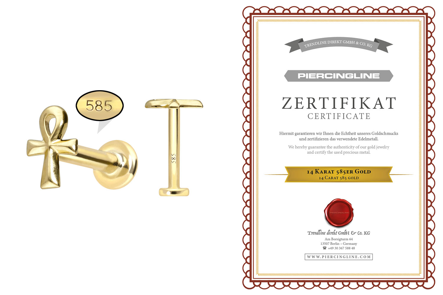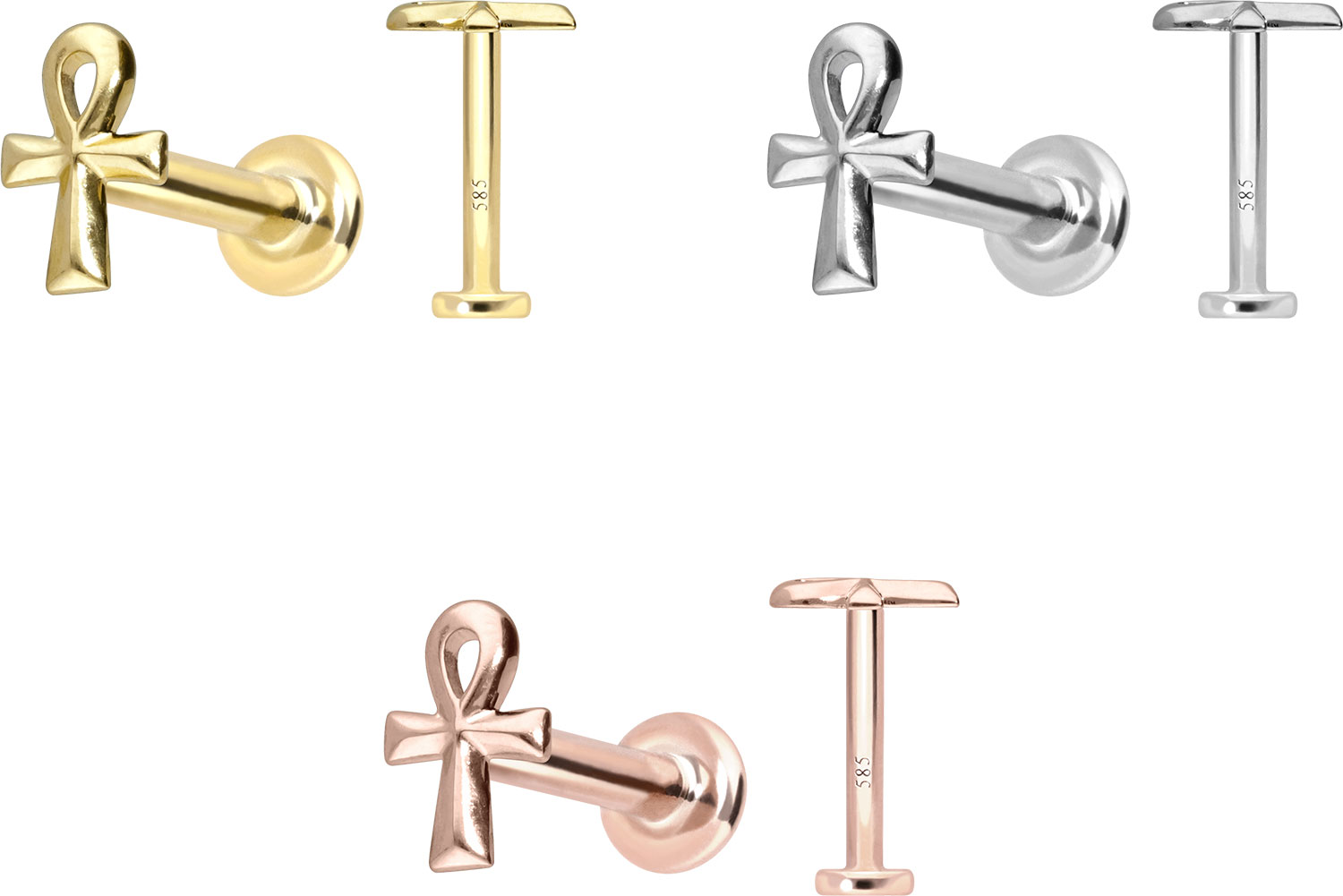 Dieses Labret ist vollständig aus hochwertigem 14 Karat (585er) Gold gefertigt, das neben seiner exzellenten Qualität auch mit Eigenschaften wie guter Hautverträglichkeit und hoher Beständigkeit zu begeistern weiß. Farblich ist es in Gelbgold, Roségold und rhodiniertem Weißgold erhältlich. Das Labret verfügt über einen zeitlos schönen Schraubaufsatz mit Außengewinde in Form eines ägyptischen Kreuzes, hat
