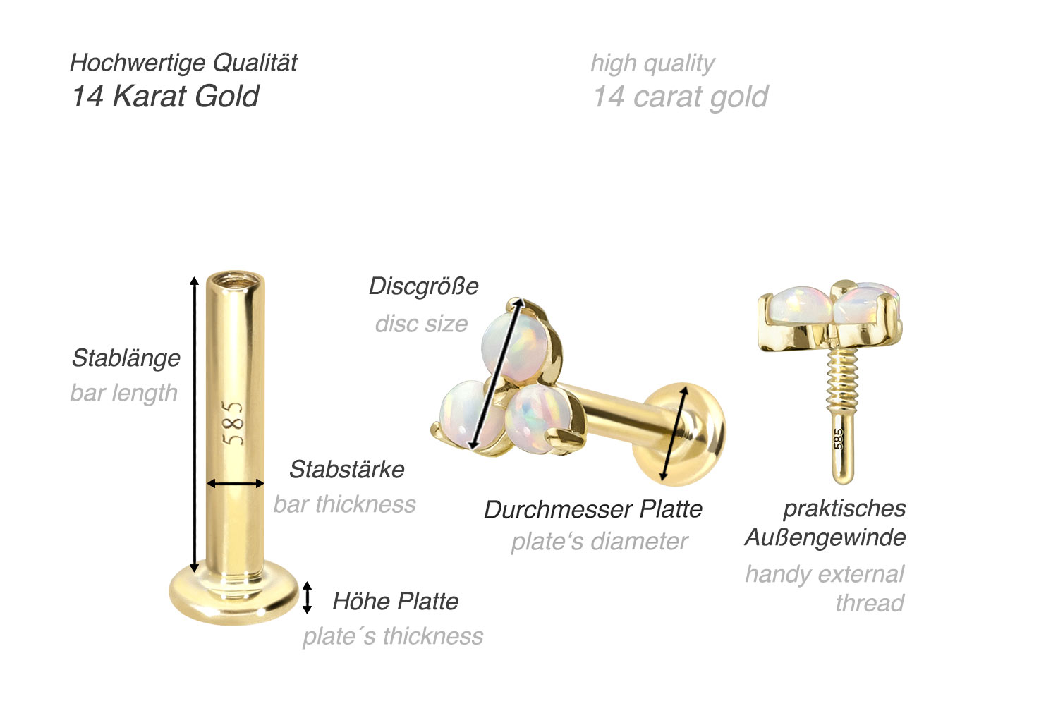 14 Karat Gold - Labret mit Innengewinde Blume + 3 synthetische Opale