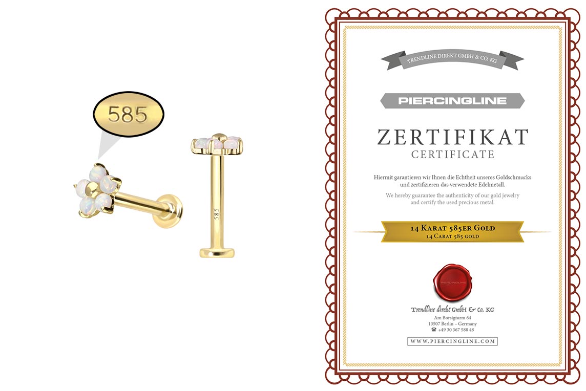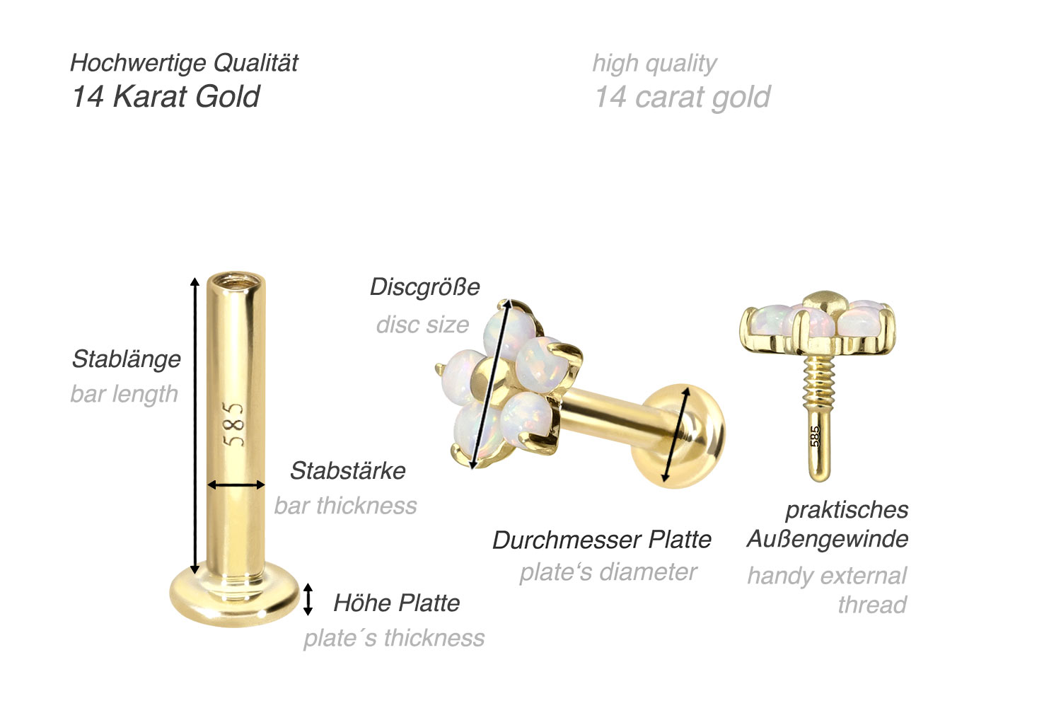 Dieses Labret ist mit Ausnhame der synthetischen Opale vollständig aus hochwertigem 14 Karat (585er) Gold gefertigt, das neben seiner exzellenten Qualität auch mit Eigenschaften wie guter Hautverträglichkeit und hoher Beständigkeit zu begeistern weiß. Farblich ist es in Gelbgold, Roségold und rhodiniertem Weißgold erhältlich. Das Labret verfügt über einen zeitlos schönen Schraubaufsatz mit Außengewinde in Form einer Blume, hat