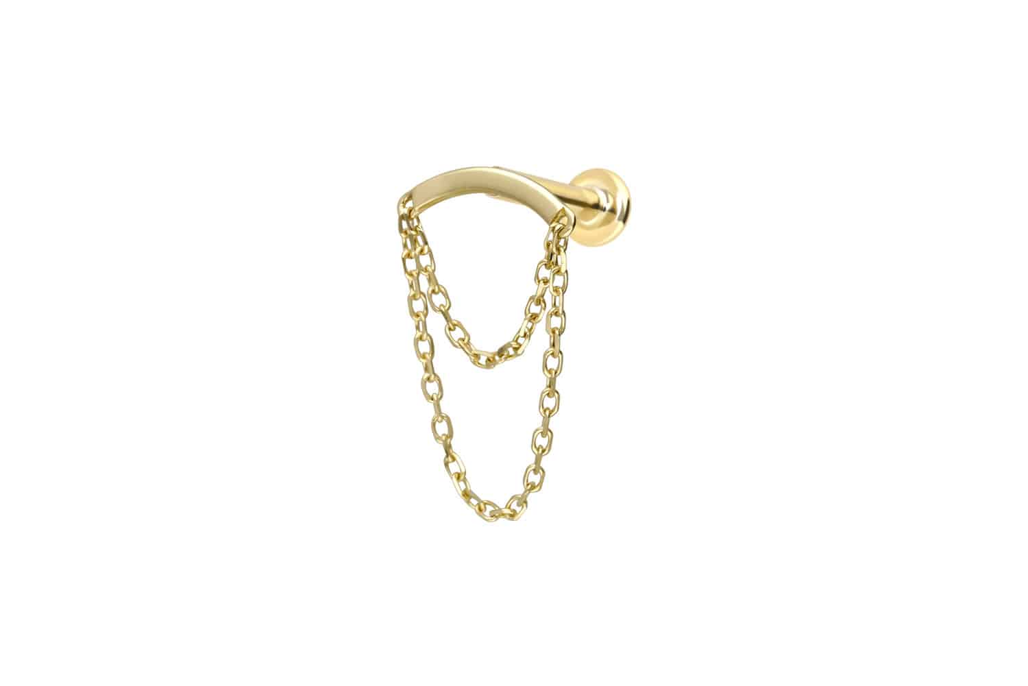 Dieses Labret ist vollständig aus hochwertigem 14 Karat (585er) Gold gefertigt, das neben seiner exzellenten Qualität auch mit Eigenschaften wie guter Hautverträglichkeit und hoher Beständigkeit zu begeistern weiß. Farblich ist es in Gelbgold, Roségold und rhodiniertem Weißgold erhältlich. Das Labret verfügt über einen zeitlos schönen Schraubaufsatz mit Außengewinde in Form eines Bogens, an welchem zwei Ketten befestigt sind, hat eine Stabstärke von entweder 1 oder 1,2 mm und ist in den