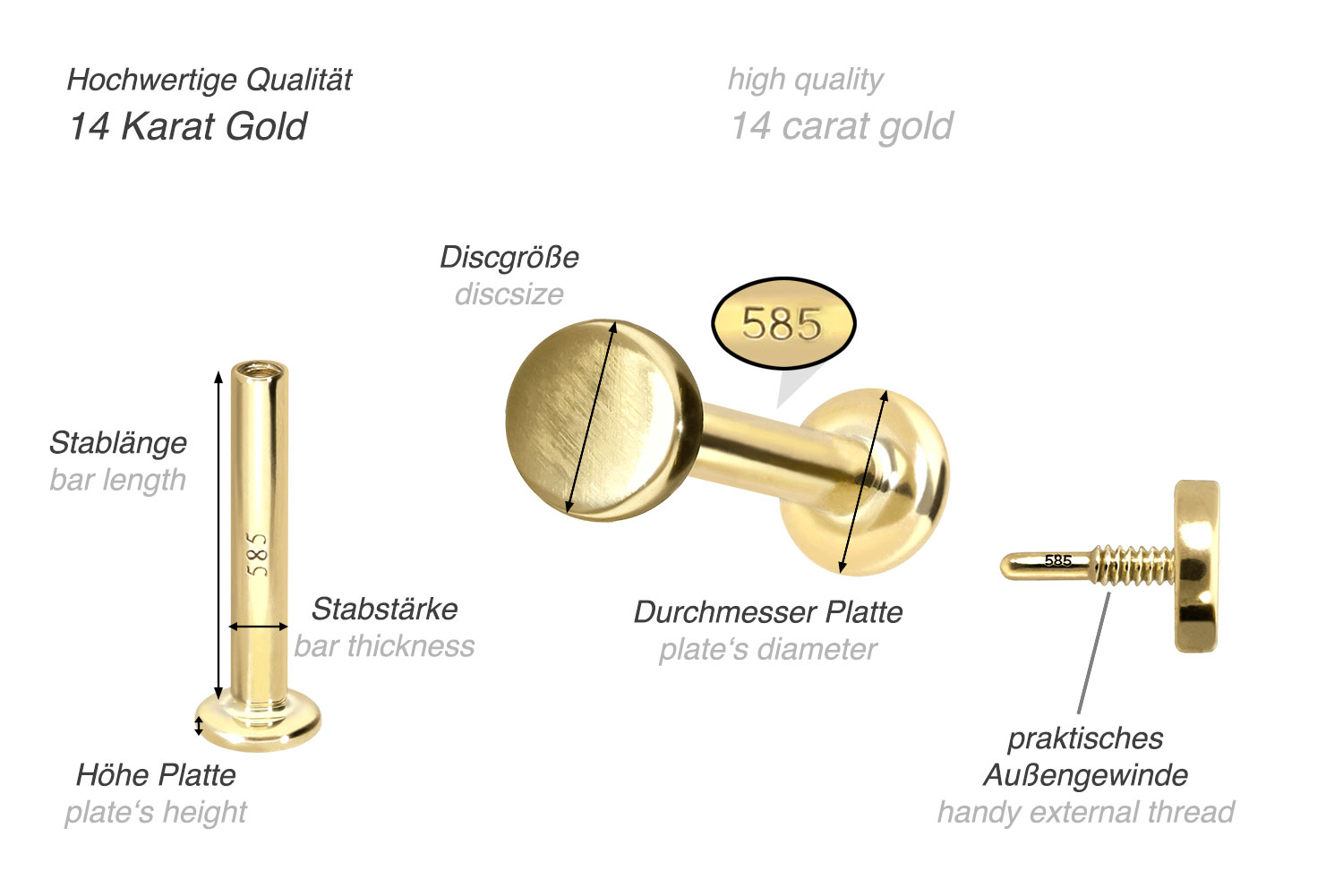 unten aufgeführten Stablängen erhältlich. Jeder Einzelne unserer Artikel aus Gold wird mit viel Liebe zum Detail in Handarbeit gefertigt und ist somit ein Unikat. Das 0,8 mm starke Innengewinde des Labrets ist mit allen Gold Produkten, die über ein solches Außengewinde verfügen, kompatibel, sodass sich vielfältige Kombinationsmöglichkeiten ergeben.