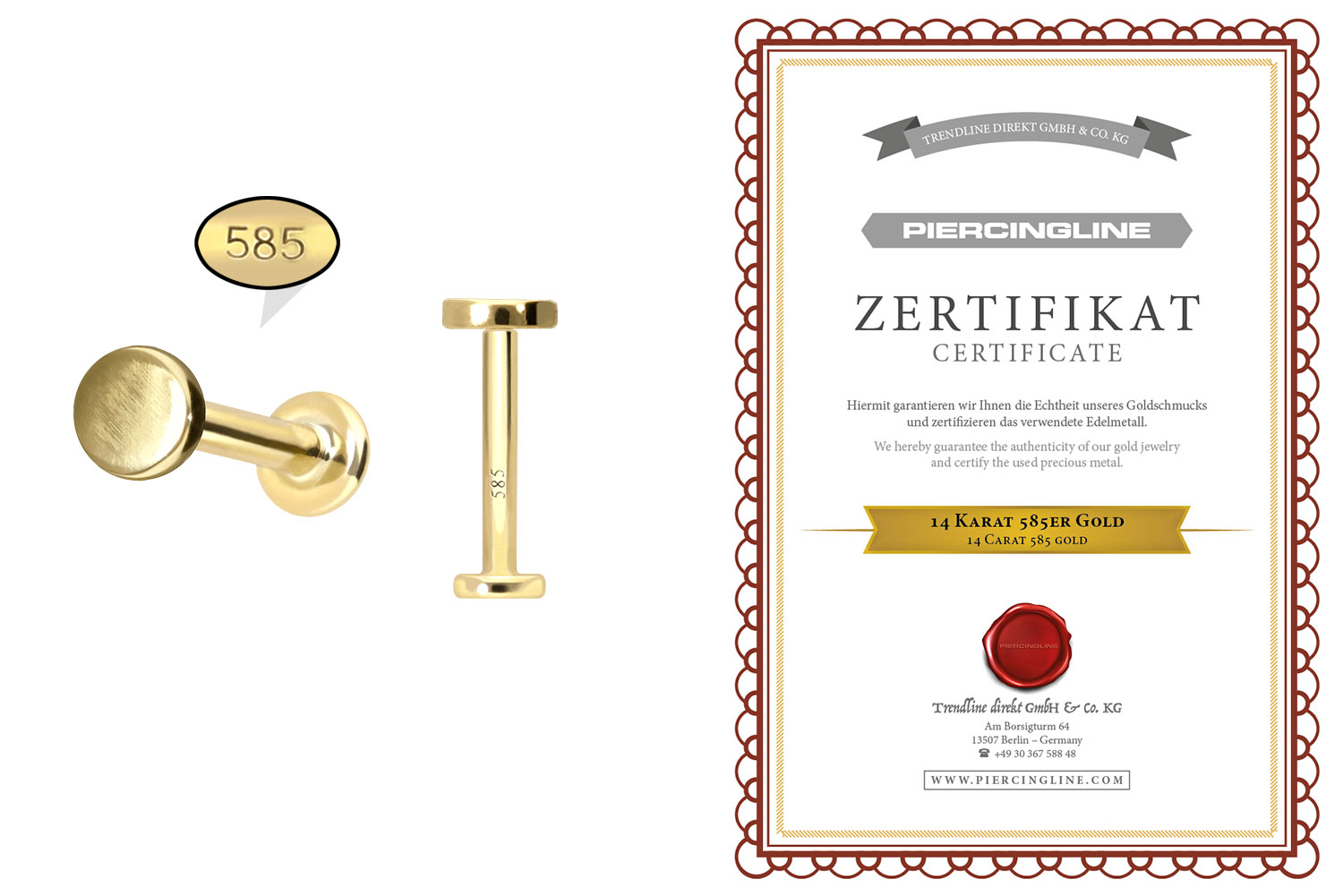 Dieses Labret ist vollständig aus hochwertigem 14 Karat (585er) Gold gefertigt, das neben seiner exzellenten Qualität auch mit Eigenschaften wie guter Hautverträglichkeit und hoher Beständigkeit zu begeistern weiß. Farblich ist es in Gelbgold, Roségold und rhodiniertem Weißgold erhältlich. Das Labret verfügt über eine zeitlos schöne Schraubdisc mit Außengewinde, hat