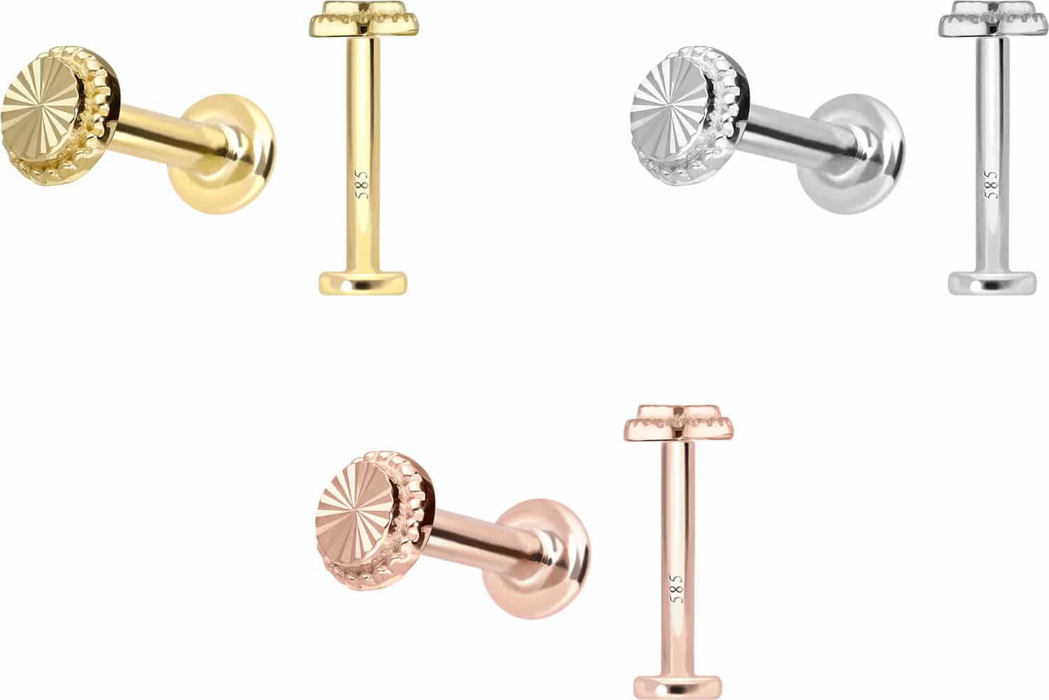 Dieses Labret ist vollständig aus hochwertigem 14 Karat (585er) Gold gefertigt, das neben seiner exzellenten Qualität auch mit Eigenschaften wie guter Hautverträglichkeit und hoher Beständigkeit zu begeistern weiß. Farblich ist es in Gelbgold, Roségold und rhodiniertem Weißgold erhältlich. Das Labret verfügt über einen zeitlos schönen Schraubdisc mit Außengewinde, hat