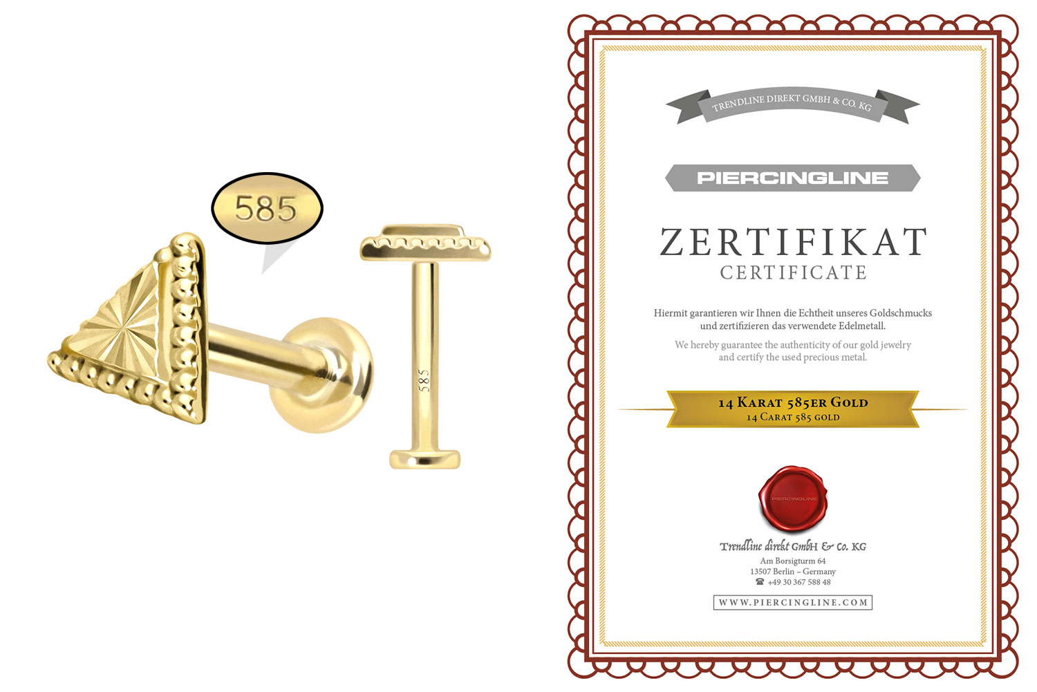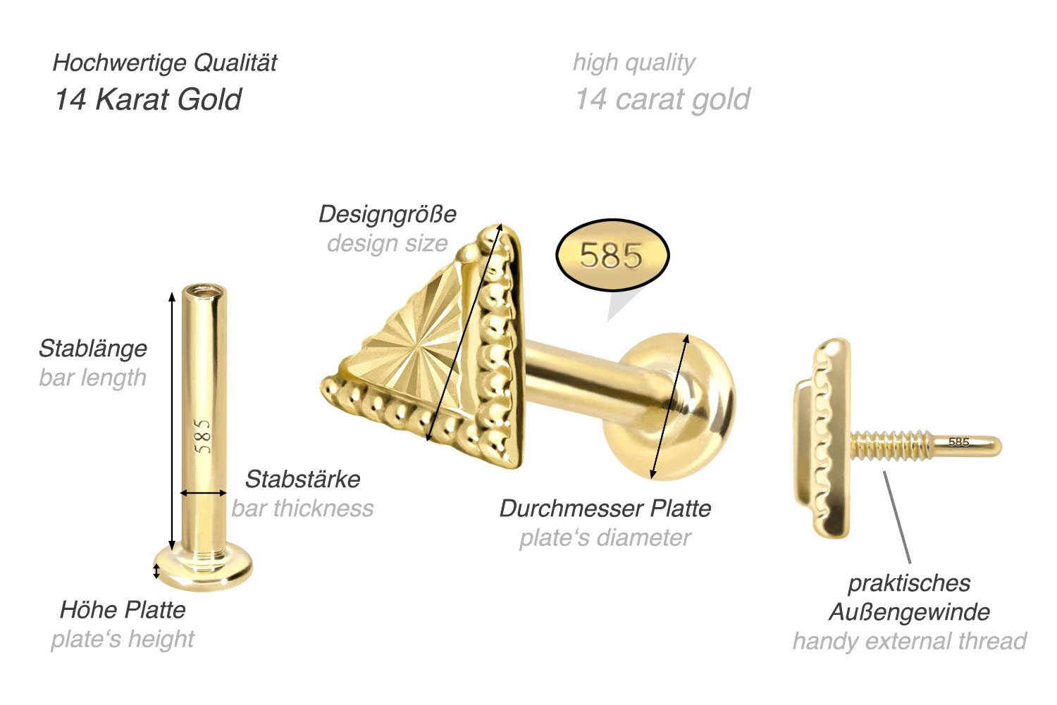 Dieses Labret ist vollständig aus hochwertigem 14 Karat (585er) Gold gefertigt, das neben seiner exzellenten Qualität auch mit Eigenschaften wie guter Hautverträglichkeit und hoher Beständigkeit zu begeistern weiß. Farblich ist es in Gelbgold, Roségold und rhodiniertem Weißgold erhältlich. Das Labret verfügt über einen zeitlos schönen Schraubaufsatz mit Außengewinde in Form eines Dreiecks, hat