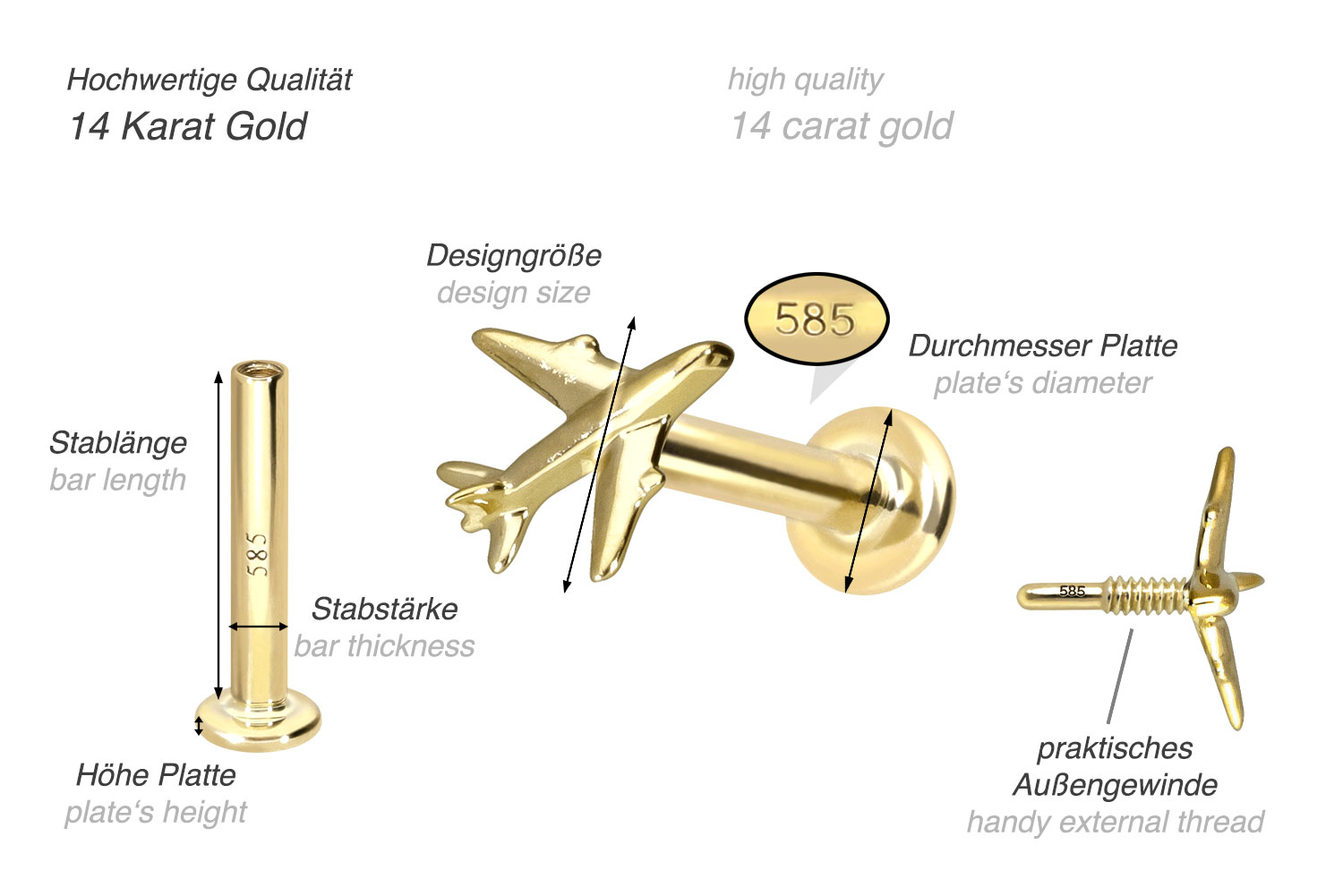 14 Karat Gold - Labret mit Innengewinde Flugzeug
