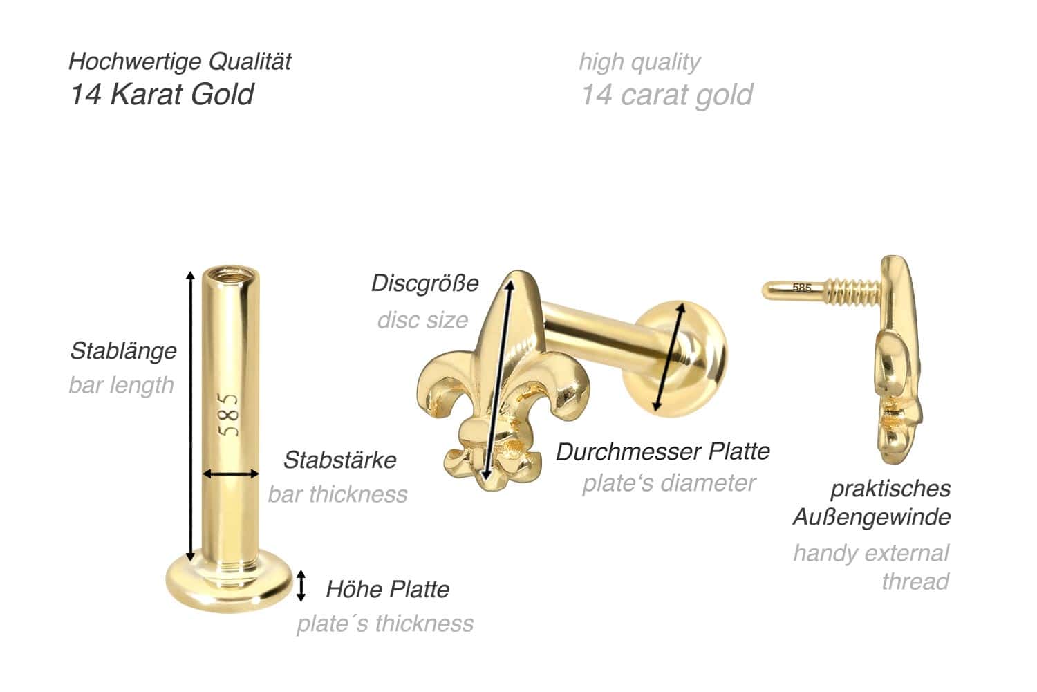 Dieses Labret ist vollständig aus hochwertigem 14 Karat (585er) Gold gefertigt, das neben seiner exzellenten Qualität auch mit Eigenschaften wie guter Hautverträglichkeit und hoher Beständigkeit zu begeistern weiß. Farblich ist es in Gelbgold, Roségold und rhodiniertem Weißgold erhältlich. Das Labret verfügt über einen zeitlos schönen Schraubaufsatz mit Außengewinde in Form einer Lilie, hat