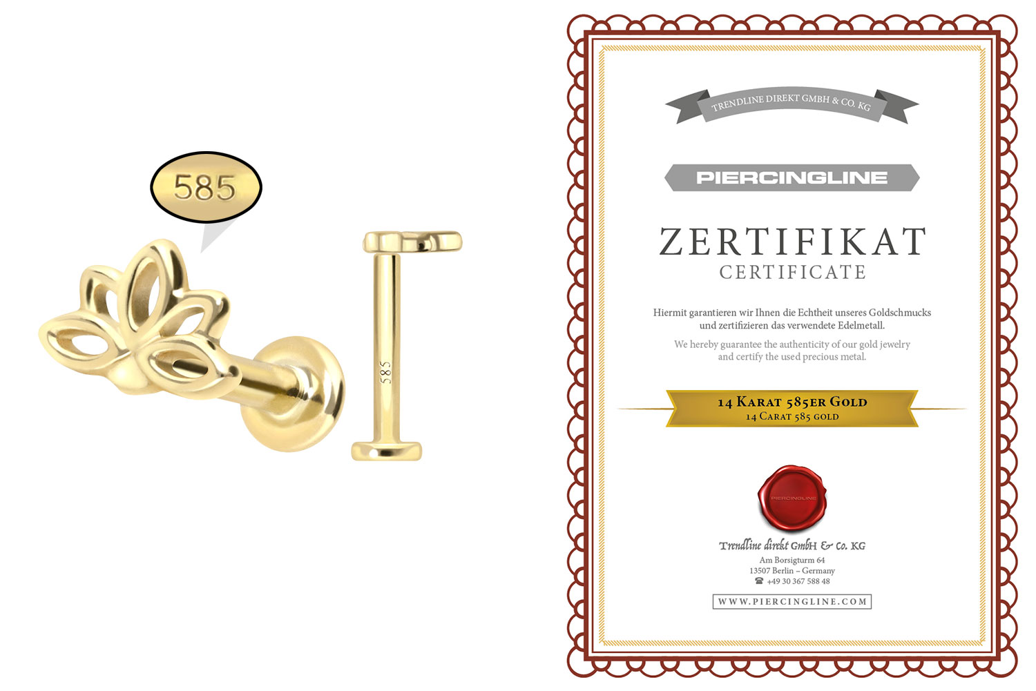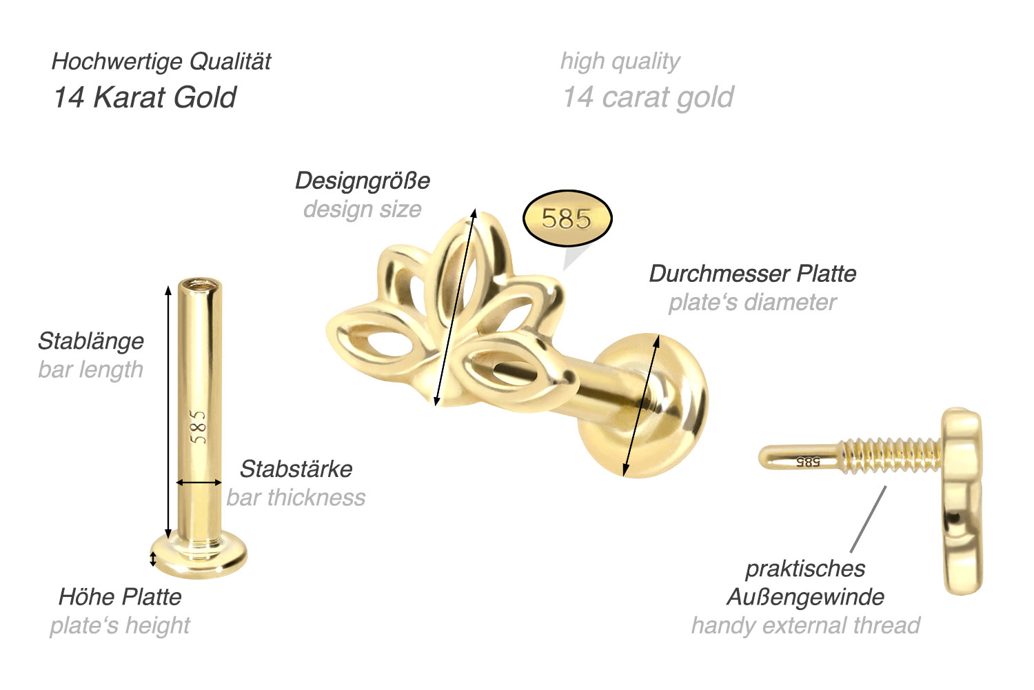 Dieses Labret ist vollständig aus hochwertigem 14 Karat (585er) Gold gefertigt, das neben seiner exzellenten Qualität auch mit Eigenschaften wie guter Hautverträglichkeit und hoher Beständigkeit zu begeistern weiß. Farblich ist es in Gelbgold, Roségold und rhodiniertem Weißgold erhältlich. Das Labret verfügt über einen zeitlos schönen Schraubaufsatz mit Außengewinde in Form einer Lotusblüte, hat