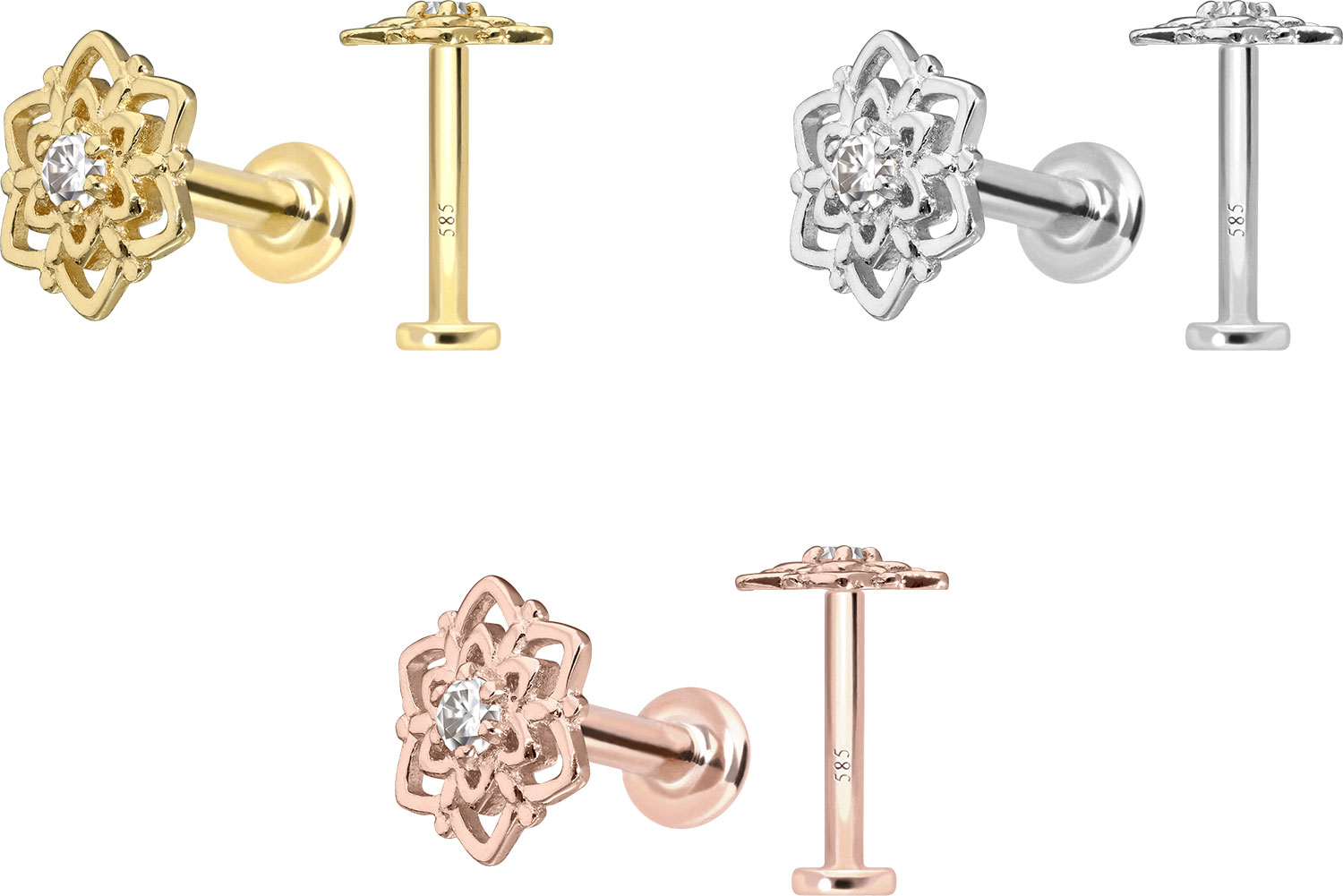 14 Karat Gold - Labret mit Innengewinde Moissanit + Blume