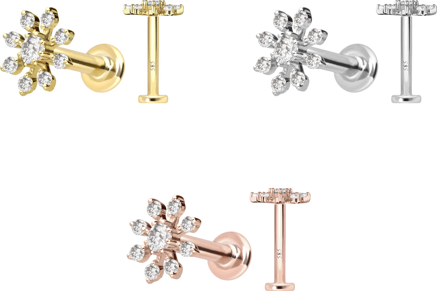 Dieses Labret ist mit Ausnahme der Moissanite vollständig aus hochwertigem 14 Karat (585er) Gold gefertigt, das neben seiner exzellenten Qualität auch mit Eigenschaften wie guter Hautverträglichkeit und hoher Beständigkeit zu begeistern weiß. Farblich ist es in Gelbgold, Roségold und rhodiniertem Weißgold erhältlich. Das Labret verfügt über einen zeitlos schönen Schraubaufsatz mit Außengewinde in Form einer Blume, hat