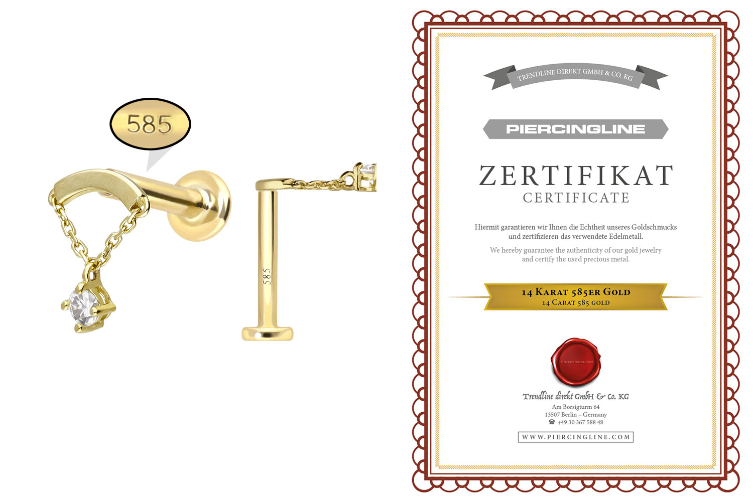 Dieses Labret ist mit Ausnahme des Moissanits vollständig aus hochwertigem 14 Karat (585er) Gold gefertigt, das neben seiner exzellenten Qualität auch mit Eigenschaften wie guter Hautverträglichkeit und hoher Beständigkeit zu begeistern weiß. Farblich ist es in Gelbgold, Roségold und rhodiniertem Weißgold erhältlich. Das Labret verfügt über einen zeitlos schönen Schraubaufsatz mit Außengewinde in Form eines Bogens, an welchem eine Kette befestigt ist, hat eine Stabstärke von entweder 1 oder 1,2 mm und ist in den